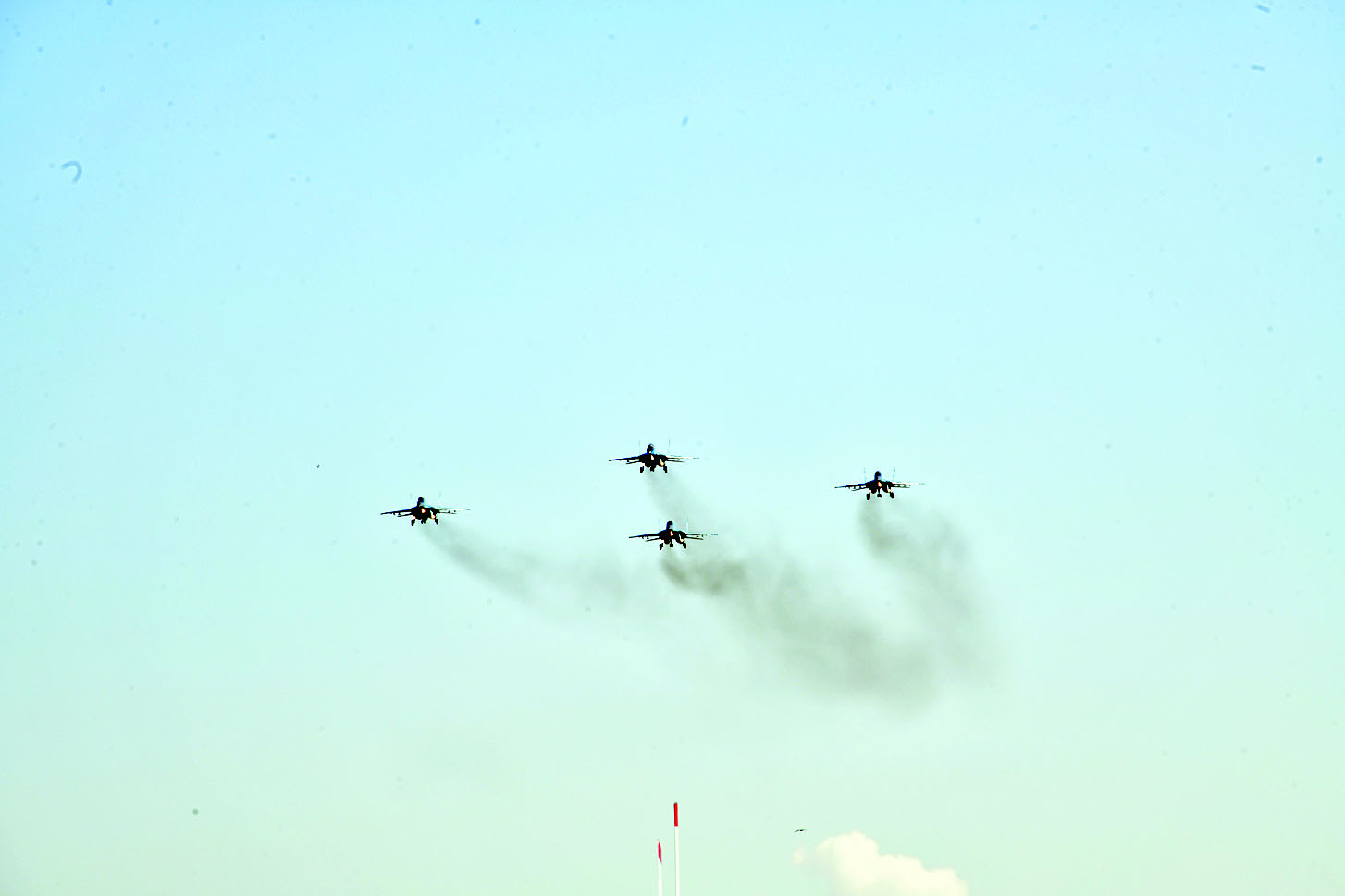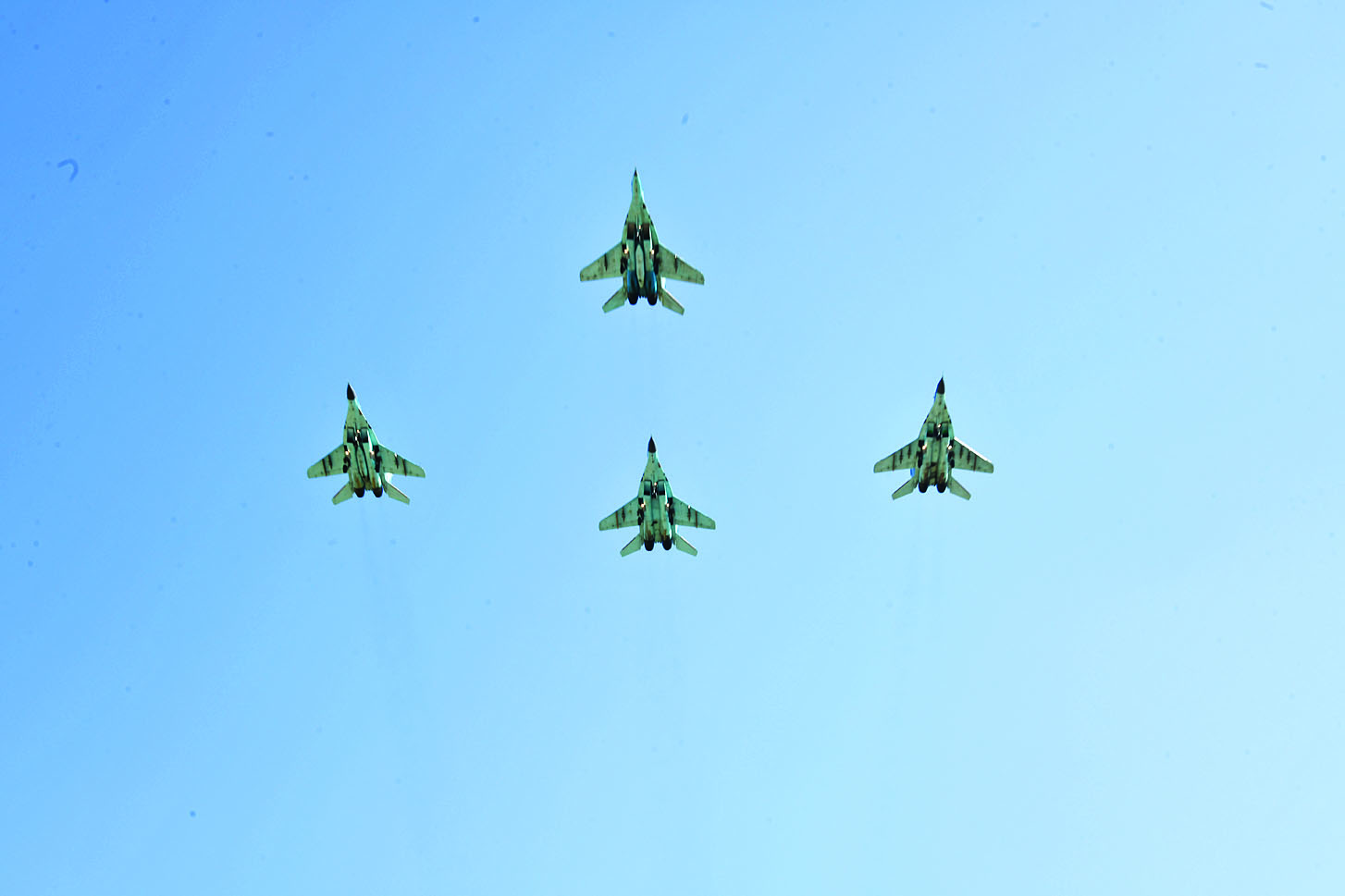 ထိုသို့ စွမ်းရည်ပြသရာတွင် MiG-29 ဘက်စုံသုံးဂျက်တိုက်လေယာဉ်တစ်စီးက ရှုရပ်၏ ရှေ့တည့်တည့်မှ ဝင်ရောက်လာပြီး Victory Roll Maneuver နှင့် Level 8 Maneuver ကိုလည်းကောင်း၊ Combat Turn နှင့် Multiple Roll Maneuver ကိုလည်းကောင်း၊ Slow Flight နှင့် Zoom Climb Maneuver ၊ Vertical Roll Maneuver တို့ကိုလည်းကောင်း စွမ်းရည်ပြပျံသန်းပြီး MiG-29 ဘက်စုံသုံး ဂျက်တိုက်လေယာဉ် ၄ စီးက ရှုရပ်၏ ရှေ့တည့်တည့်မှ Box Formation ပုံစံဖြင့် အုပ်ဖွဲ့ပျံသန်းအလေးပြုကြသည်။