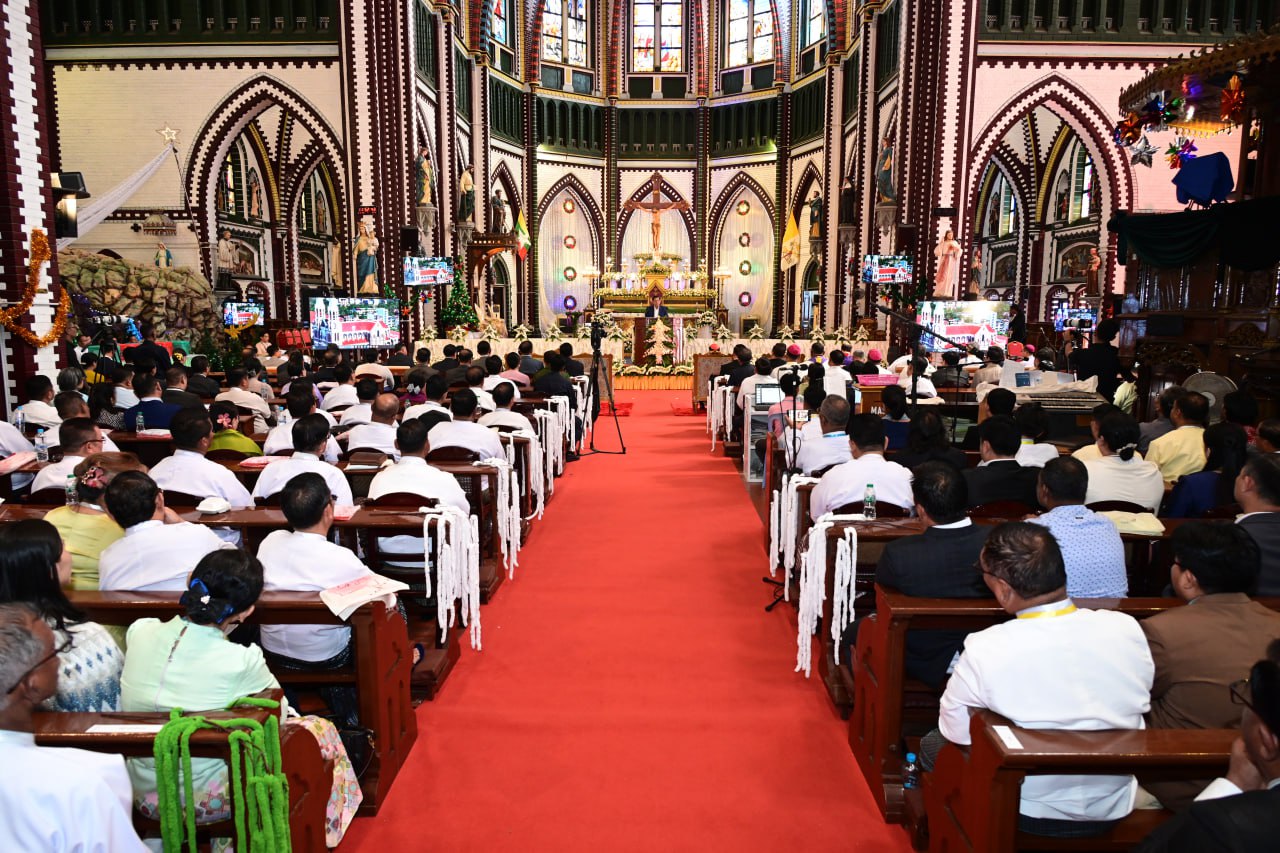 မြန်မာနိုင်ငံခရစ်ယာန်အသင်းတော်ပေါင်းစုံအဖွဲ့ချုပ်ကြီးများက ကြီးမှူးကျင်းပသည့် ခရစ်တော်မွေးနေ့ (ခရစ္စမတ်) ကျေးဇူးတော် ချီးမွမ်းခြင်းနှင့် မိတ်သဟာယမိတ်ဆုံစားပွဲအခမ်းအနားကို ယနေ့နံနက်ပိုင်းတွင် ရန်ကုန်တိုင်းဒေသကြီး၊ ဗိုလ်တထောင်မြို့နယ်ရှိ စိန့်မေရီကာသီဒြယ်ကက်သလစ်ဘုရားကျောင်းတော်ကြီး၌ ကျင်းပပြုလုပ်ရာ ပြည်ထောင်စုသမ္မတမြန်မာနိုင်ငံတော်ယာယီသမ္မတ နိုင်ငံတော်လုံခြုံရေးနှင့်အေးချမ်းသာယာရေးကော်မရှင်ဥက္ကဋ္ဌ ဗိုလ်ချုပ်မှူးကြီး မင်းအောင်လှိုင် တက်ရောက်ချီးမြှင့်သည်။