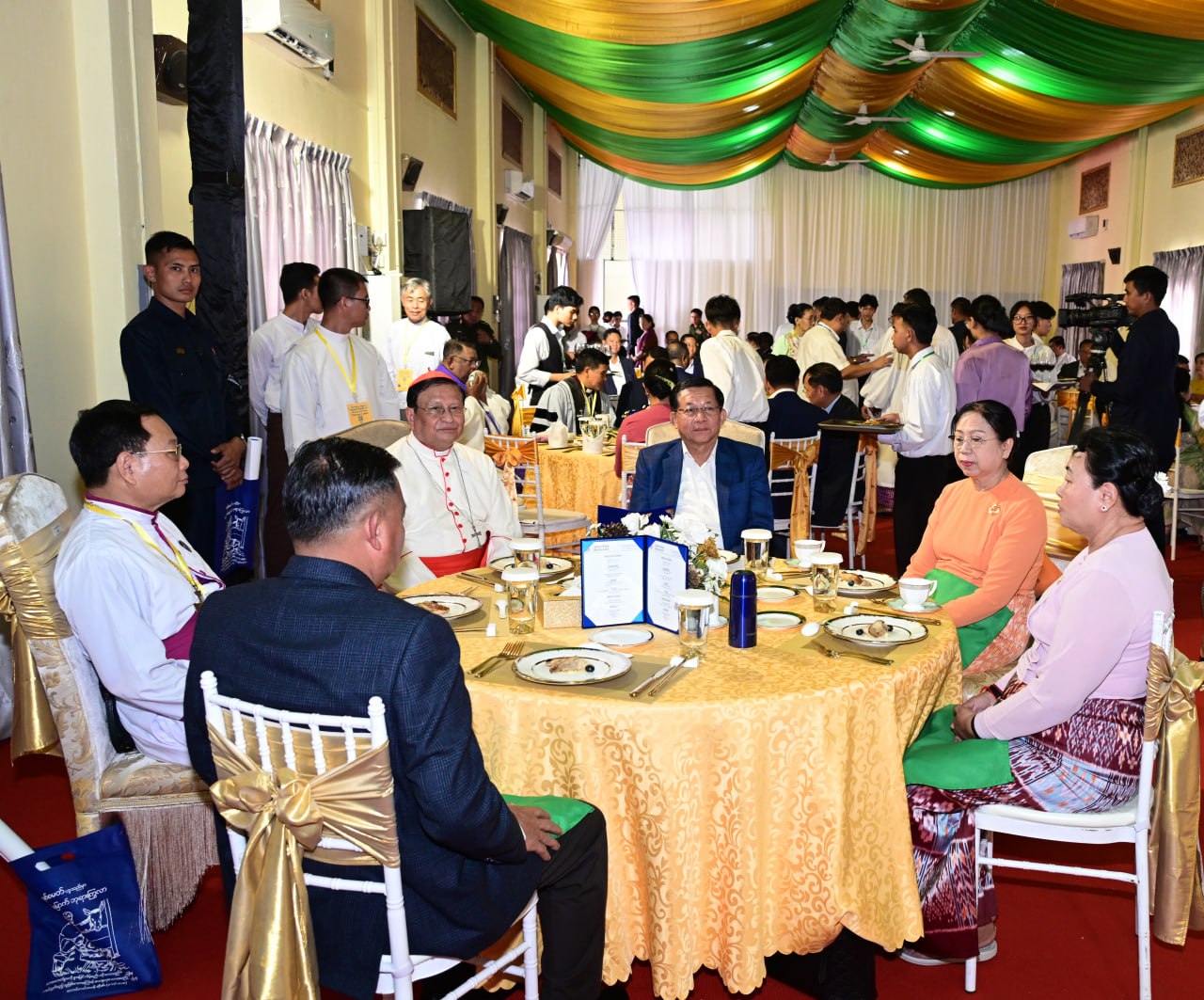 ၎င်းနောက် နိုင်ငံတော်ယာယီသမ္မတ နိုင်ငံတော်လုံခြုံရေးနှင့်အေးချမ်းသာယာရေးကော်မရှင်ဥက္ကဋ္ဌနှင့် ဇနီး၊ အဖွဲ့ဝင်များ၊ တက်ရောက်လာကြသည့် ဧည့်ပရိသတ်များသည် မြန်မာနိုင်ငံခရစ်ယာန်အသင်းတော်ပေါင်းစုံအဖွဲ့ချုပ်ကြီးများမှ တည်ခင်းဧည့်ခံသည့် မိတ်သဟာယမိတ်ဆုံစားပွဲကို အတူတကွသုံးဆောင်ခဲ့ကြကြောင်း သတင်းရရှိသည်။