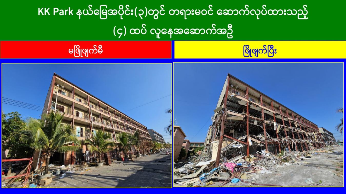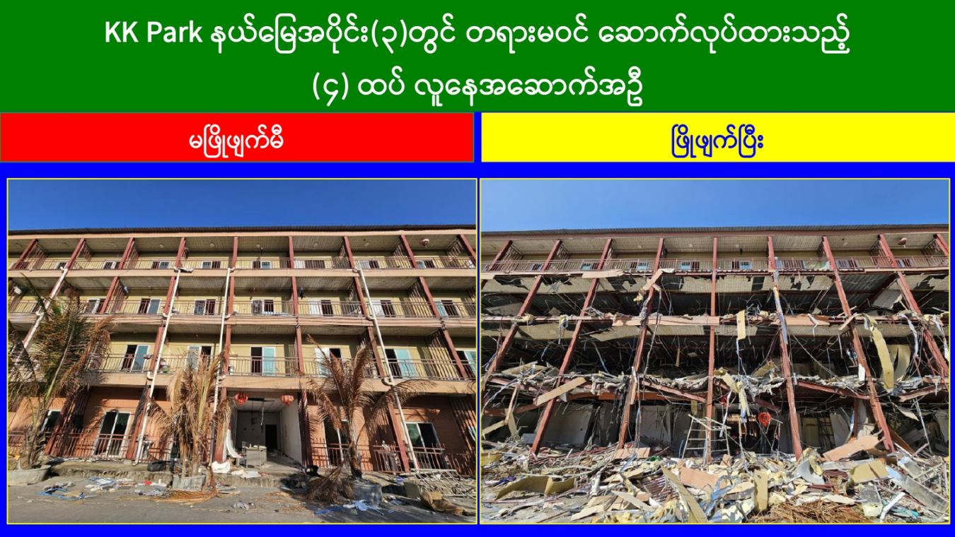 ထိုသို့ အွန်လိုင်းလိမ်လည်လောင်းကစားမှုတိုက်ဖျက်ရေး လုပ်ငန်းများဆောင်ရွက်လျက်ရှိရာ ယနေ့တွင် မြဝတီ-မဲထော်သလေး(KK Park) နယ်မြေအတွင်းရှိ အွန်လိုင်းလိမ်လည်လောင်းကစားမှုများကျူးလွန်ရာတွင် အသုံးပြုခဲ့သည့် အပိုင်း(၃)နယ်မြေအတွင်းရှိ တရားမဝင် ၄ ထပ်အဆောက်အအုံ ၃ လုံး၊ ၃ ထပ်အဆောက်အအုံ ၂ လုံးတို့ကို ထပ်မံဖြိုချဖျက်ဆီးခဲ့သဖြင့် KK Park နယ်မြေအတွင်းရှိ တရားမဝင်အဆောက်အအုံ စုစုပေါင်း ၆၃၅ လုံး အနက် ၄၉၉ လုံးကို စနစ်တကျဖြိုချဖျက်ဆီးပြီးဖြစ်ကြောင်း သိရှိရသည်။ အဆိုပါ KK Park နယ်မြေအတွင်းရှိ အဆောက်အအုံများအနက် ယာဉ်ယန္တရားများအသုံးပြု၍ ဖြိုချဖျက်ဆီးခြင်းများ ဆောင်ရွက်ပြီးစီးခဲ့သည့် တရားမဝင်အဆောက်အအုံများကို အလုံးစုံပျက်စီးစေရန်အတွက် လေအိုးမီးအိုးဖြင့် ထပ်မံဖျက်ဆီးခြင်းများကိုလည်း ဒီဇင်ဘာ ၁၄ ရက်မှ စတင်ဆောင်ရွက်ခဲ့ရာ ယနေ့တွင် ၄ ထပ် အဆောက်အအုံ ၃ လုံးကို ထပ်မံဖျက်ဆီးနိုင်ခဲ့သဖြင့် စုစုပေါင်းအဆောက်အအုံ ၄၉ လုံးကို ရာခိုင်နှုန်းပြည့်ဖျက်ဆီးပြီးဖြစ်ကြောင်း သိရှိရသည်။
