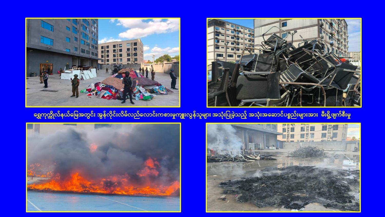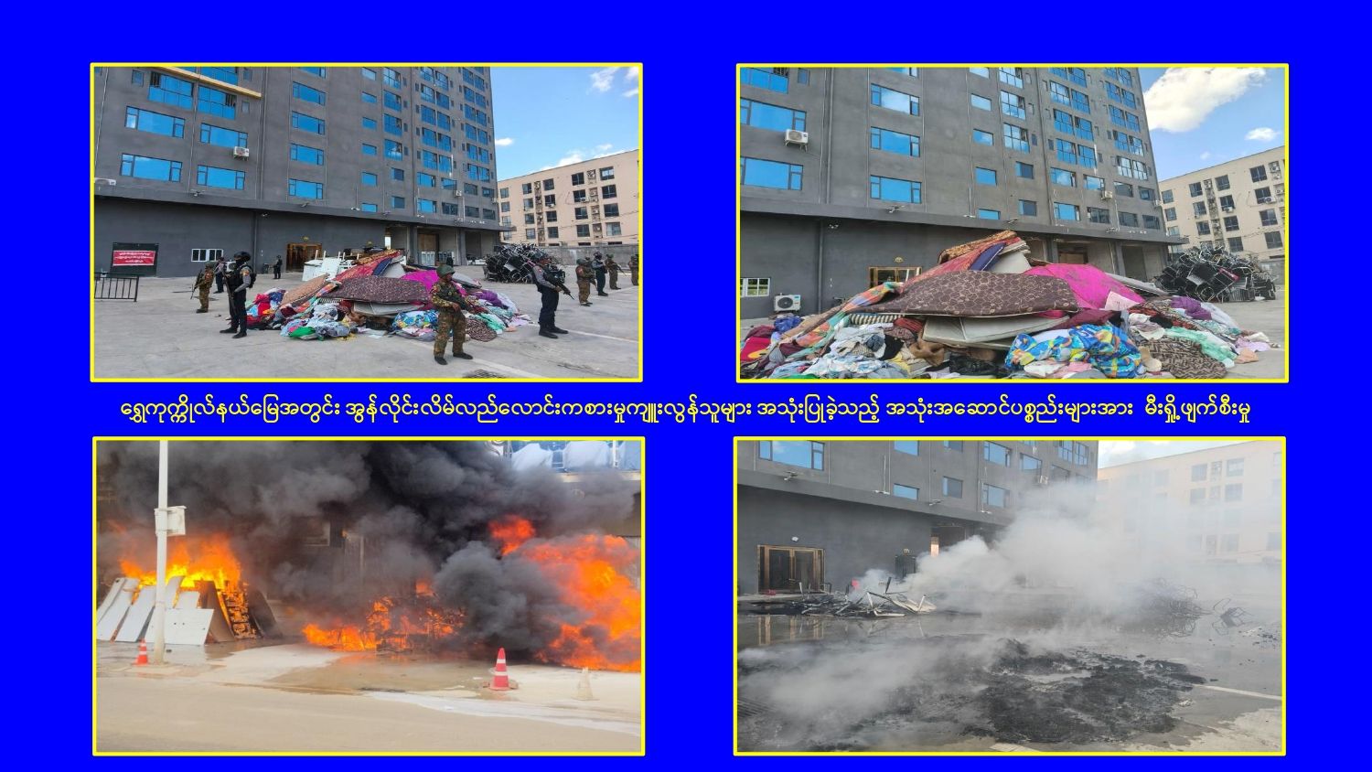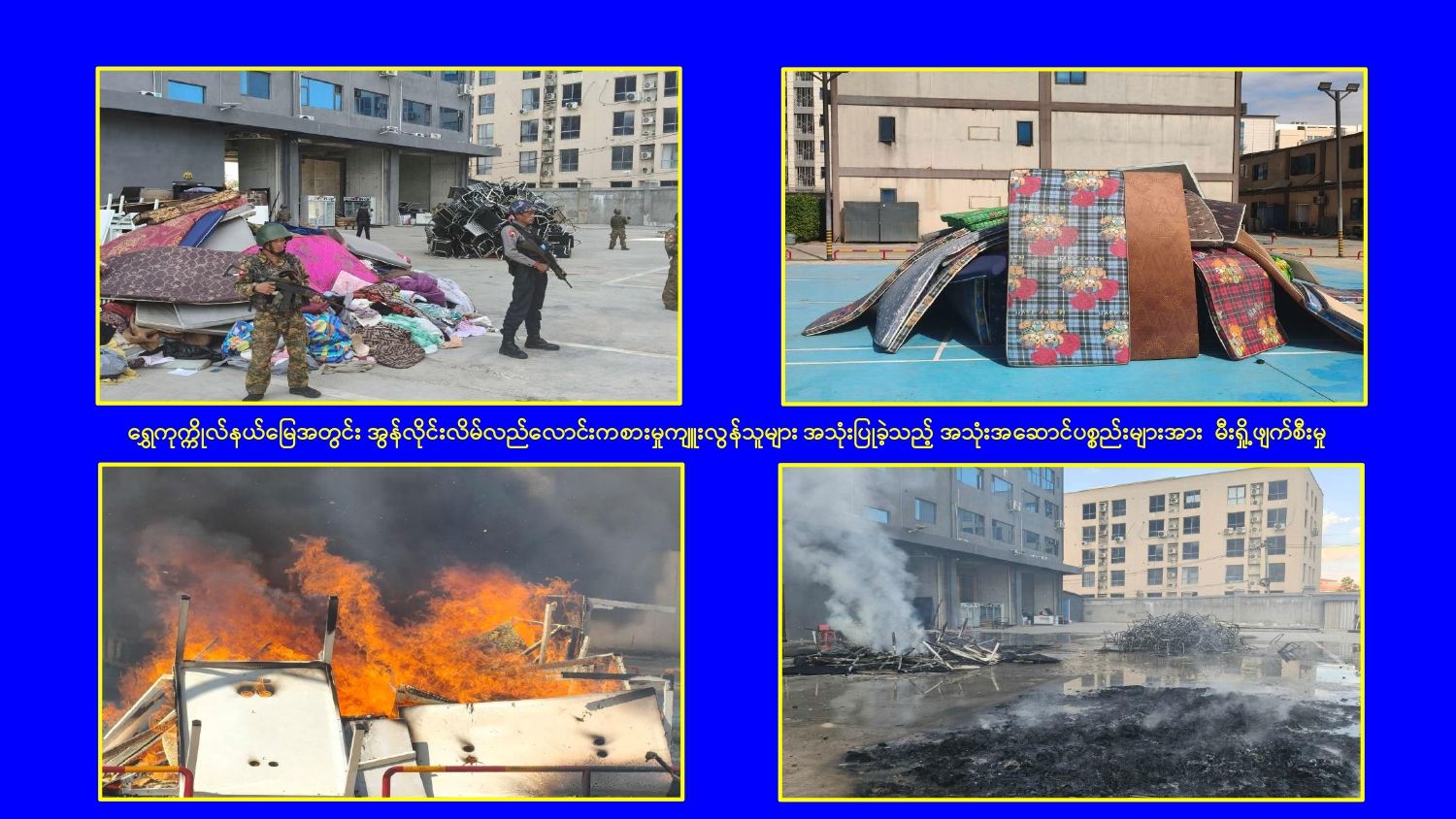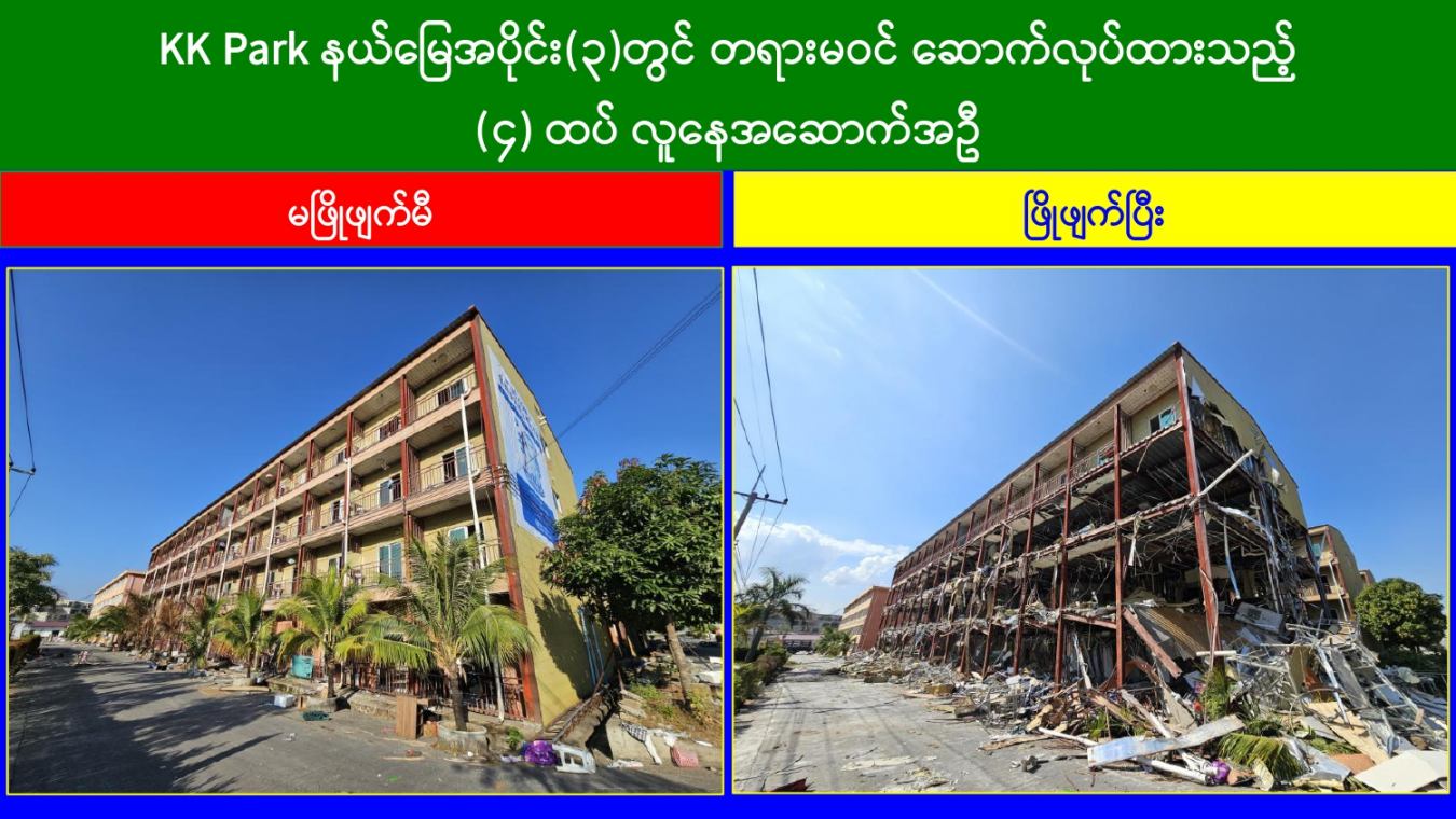 KK Park နယ်မြေအတွင်း အွန်လိုင်းလိမ်လည်လောင်းကစားမှုကျူးလွန်ရာတွင် အသုံးပြုသည့် တရားမဝင်အဆောက်အအုံ ၄၉၉ လုံးကို စနစ်တကျဖြိုချဖျက်ဆီးပြီးစီး၊ အွန်လိုင်းလိမ်လည်လောင်းကစားမှုကျူးလွန်ရာတွင် အသုံးပြုခဲ့သည့် ပစ္စည်းများအား စနစ်တကျဆက်လက်မီးရှို့ဖျက်ဆီး