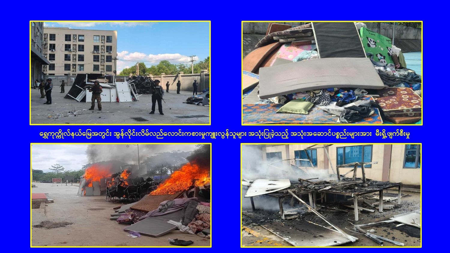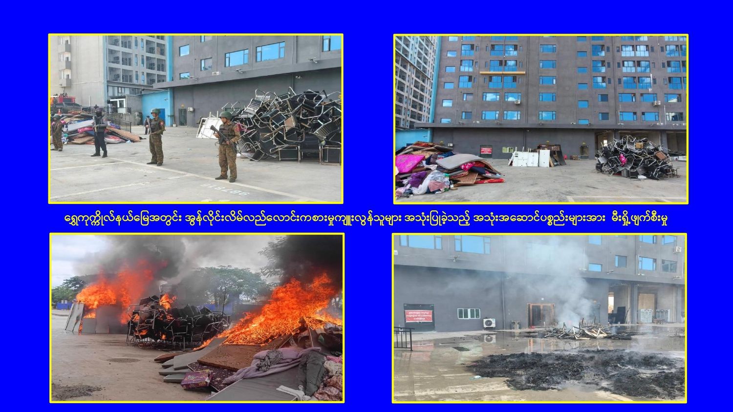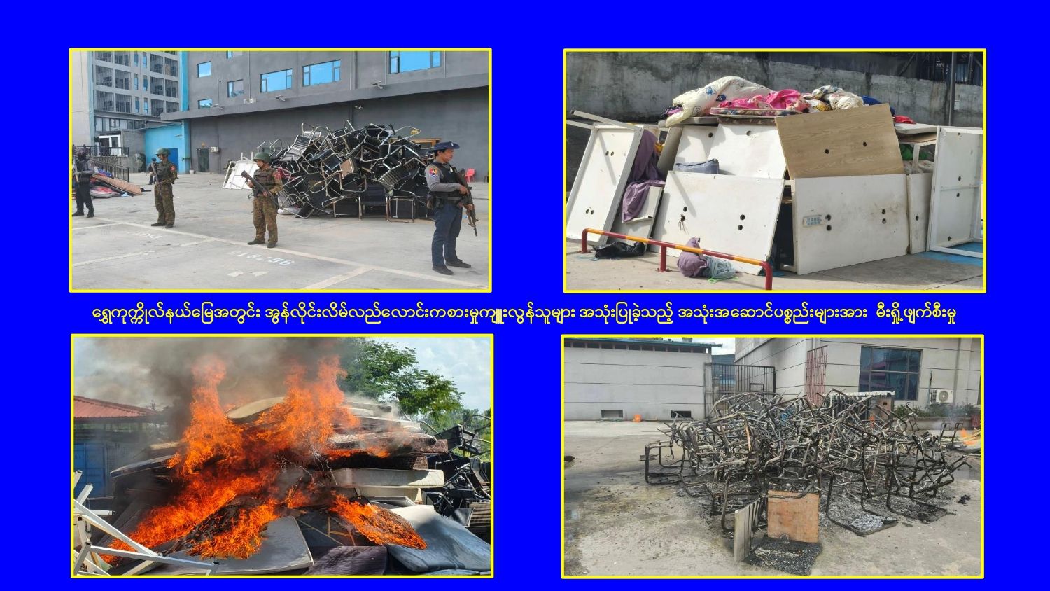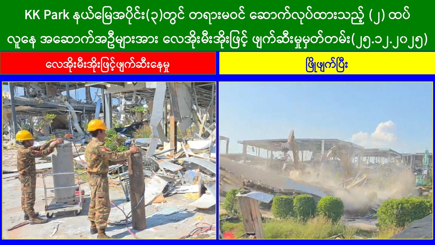 KK Park နယ်မြေအတွင်း အွန်လိုင်းလိမ်လည်လောင်းကစားမှုကျူးလွန်ရာတွင် အသုံးပြုသည့် တရားမဝင်အဆောက်အအုံ ၄၉၉ လုံးကို စနစ်တကျဖြိုချဖျက်ဆီးပြီးစီး၊ အွန်လိုင်းလိမ်လည်လောင်းကစားမှုကျူးလွန်ရာတွင် အသုံးပြုခဲ့သည့် ပစ္စည်းများအား စနစ်တကျဆက်လက်မီးရှို့ဖျက်ဆီး