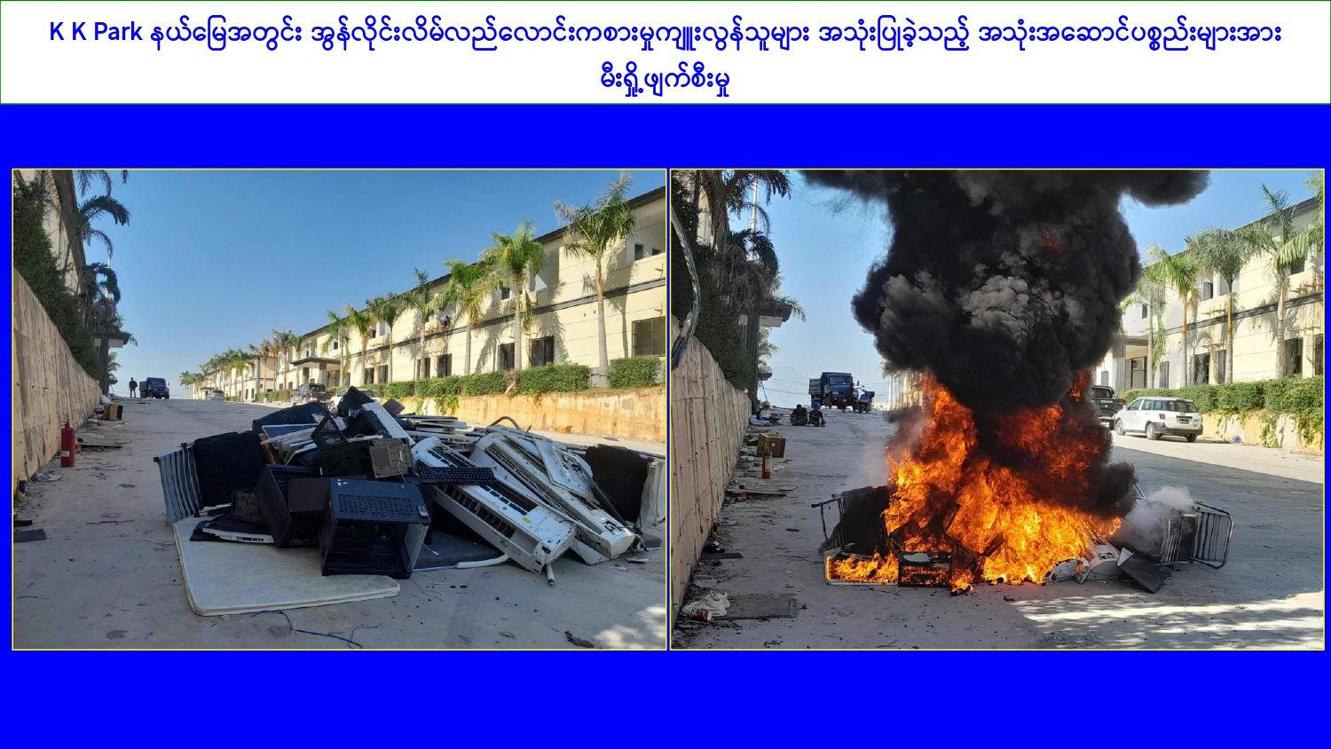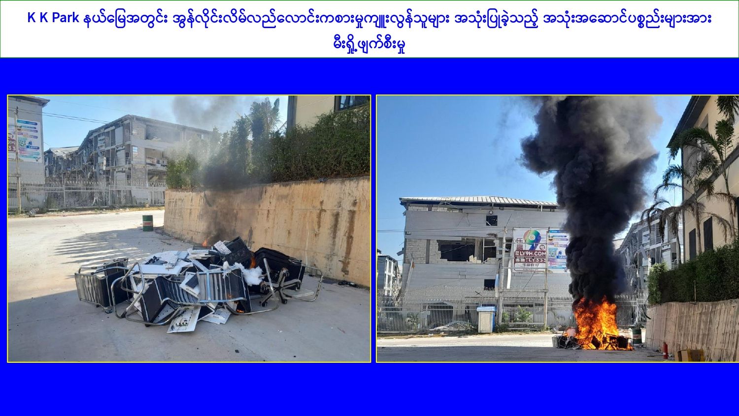 ၎င်းအပြင် KK park နှင့်ရွှေကုက္ကိုလ်နယ်မြေရှိ အွန်လိုင်းလိမ်လည်လောင်းကစားမှု ကျူးလွန်ရာတွင် အသုံးပြုခဲ့သည့်ပစ္စည်းများအား ထပ်မံအသုံးပြုမှုမရှိစေရေးအတွက် ယနေ့တွင်လည်း စနစ်တကျမီးရှို့ဖျက်ဆီးခဲ့ကြောင်းနှင့် နိုင်ငံတော်အစိုးရအနေဖြင့် အွန်လိုင်းလိမ်လည်လောင်းကစားမှုကျူးလွန်မှုများကို အမျိုးသားရေးတာဝန်တစ်ရပ်အဖြစ်ခံယူကာ မြန်မာနိုင်ငံအတွင်း လုံးဝအခြေမပြုနိုင်ရေး ပြည်တွင်းအင်အားစုများအပြင် အိမ်နီးချင်းနိုင်ငံအစိုးရများနှင့်လည်း ပေါင်းစပ်ညှိနှိုင်း၍ ဆက်လက်ဆောင်ရွက်သွားမည်ဖြစ်ကြောင်း သတင်းရရှိသည်။