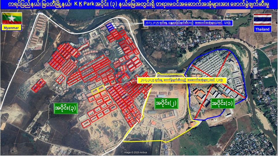 ယနေ့တွင် မြဝတီ-မဲထော်သလေး (KK Park) အပိုင်း(၃)နယ်မြေအတွင်းရှိ အွန်လိုင်းလိမ်လည်လောင်းကစားမှုများ ကျူးလွန်ရာတွင် အသုံးပြုခဲ့သည့် တရားမဝင် ၄ ထပ်အဆောက်အအုံ ၃ လုံး၊ ၂ ထပ်အဆောက်အအုံ ၂ လုံး စုစုပေါင်း တရားမဝင်အဆောက်အအုံ ၅ လုံးတို့ကို ထပ်မံဖြိုချဖျက်ဆီးခဲ့သဖြင့် KK Park နယ်မြေအတွင်းရှိတရားမဝင် အဆောက်အအုံ စုစုပေါင်း ၆၃၅ လုံး အနက် ၅၀၉ လုံးကို စနစ်တကျဖြိုချဖျက်ဆီးပြီးဖြစ်ကြောင်း သိရှိရသည်။
