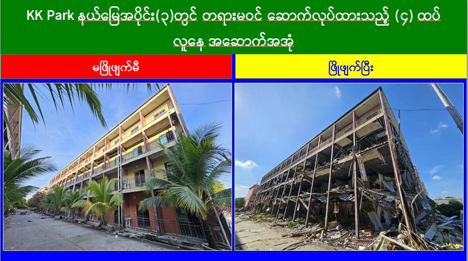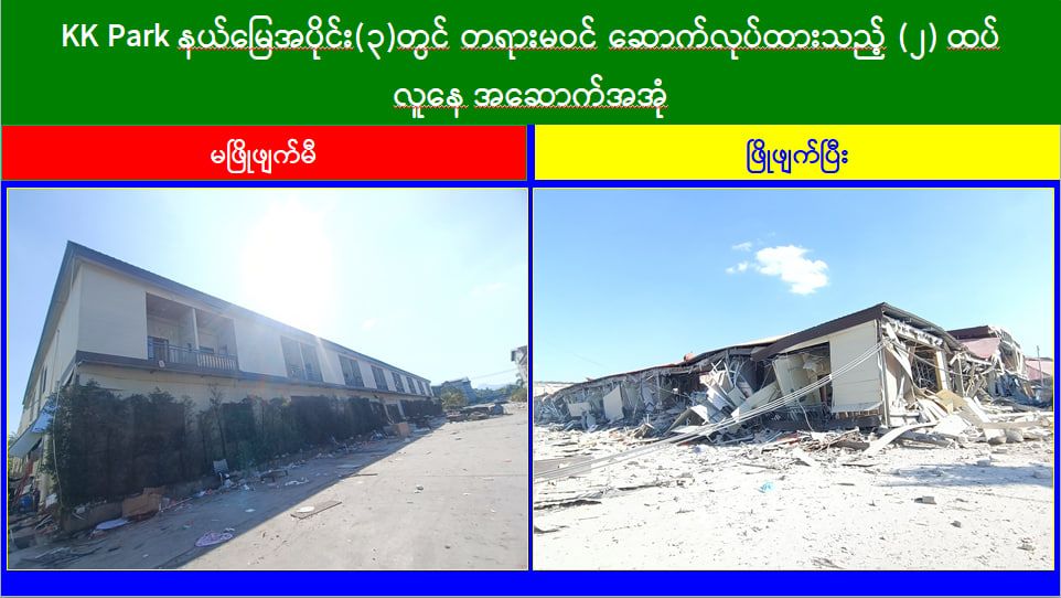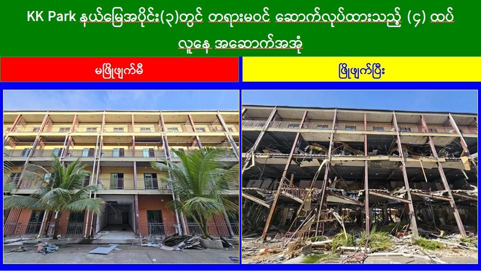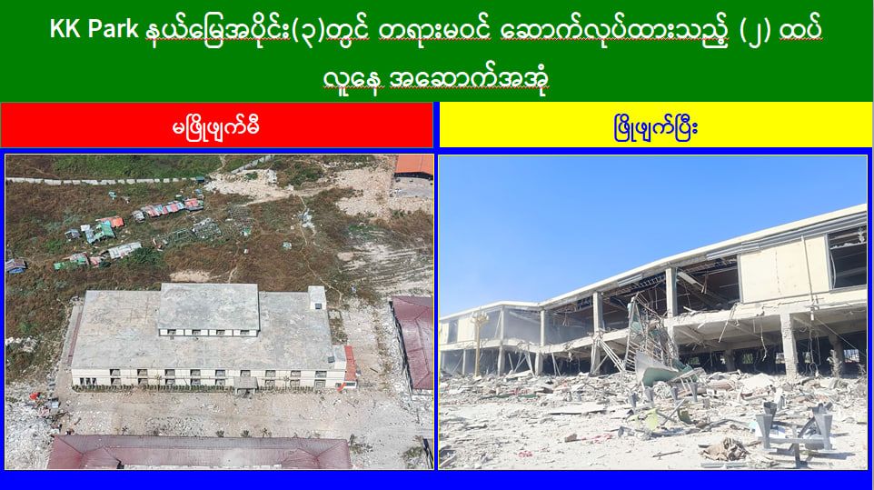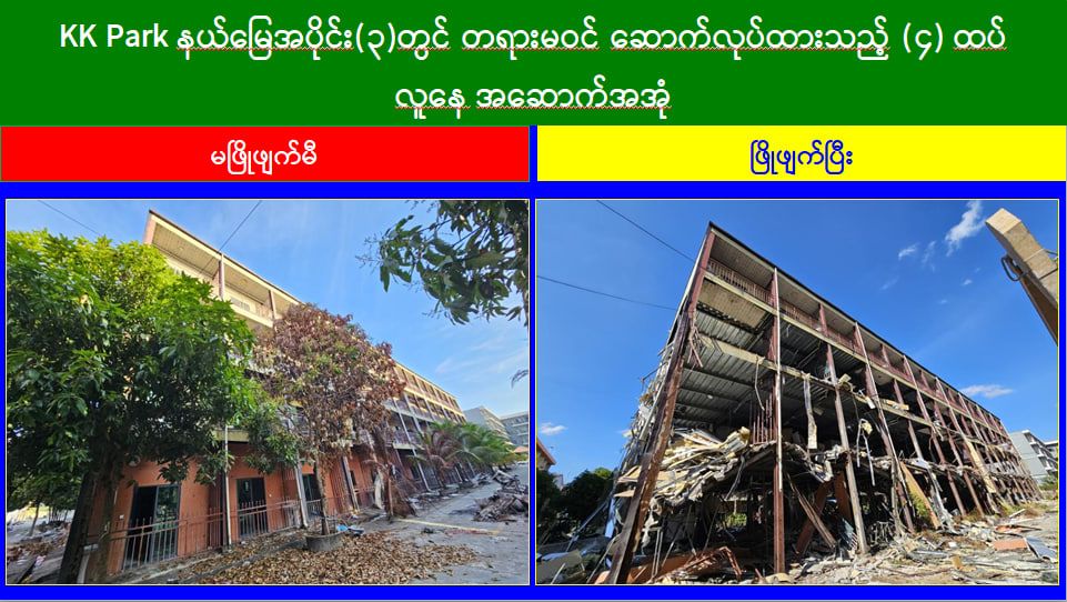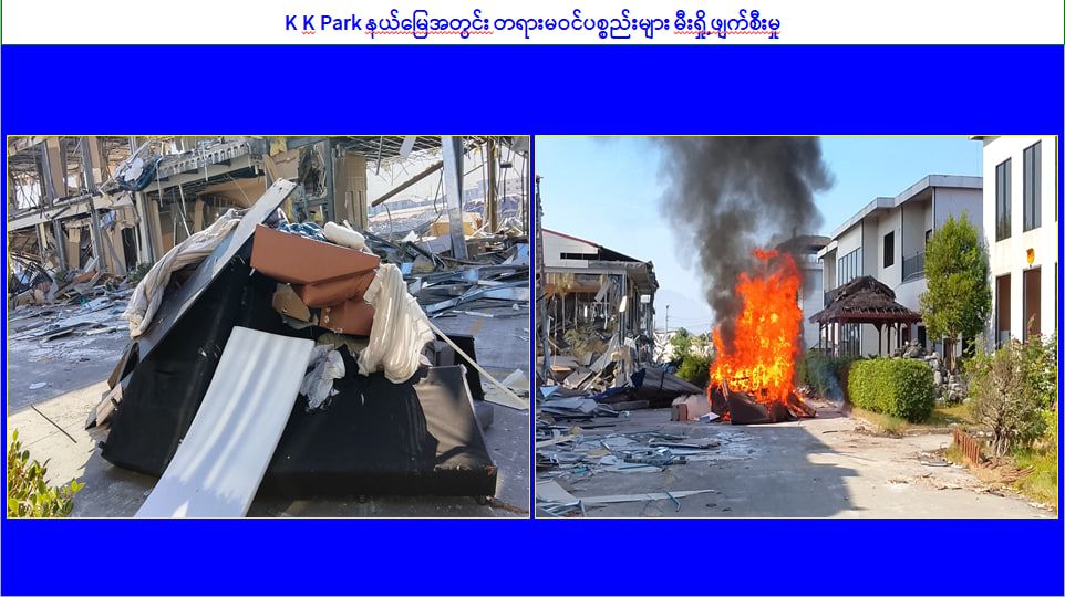 မြန်မာနိုင်ငံအစိုးရအနေဖြင့် အွန်လိုင်းလိမ်လည်လောင်းကစားမှုများ အများဆုံးအခြေချလုပ်ကိုင်လျက်ရှိကြသည့် ရွှေကုက္ကိုလ်နယ်မြေနှင့် KK Park နယ်မြေများရှိ တရားမဝင်အဆောက်အအုံများအတွင်း ဝင်ရောက်ရှင်းလင်းခြင်း၊ အွန်လိုင်းလိမ်လည်လောင်းကစားမှုလုပ်ငန်းစဉ်များတွင် အသုံးပြုခဲ့သည့် သိမ်းဆည်းရမိပစ္စည်းများနှင့် တရားမဝင်အဆောက်အအုံများအား စနစ်တကျဖြိုချဖျက်ဆီးခြင်းများကို လုံခြုံရေးတပ်ဖွဲ့ဝင်များ၊ အုပ်ချုပ်ရေးအဖွဲ့အစည်းများနှင့် ဒေသတွင်းတာဝန်ရှိသူများအပါအဝင် အဖွဲ့စုံပါဝင်သည့် ပူးပေါင်းအဖွဲ့ဖြင့် ဆောင်ရွက်လျက်ရှိရာ ယနေ့တွင် KK Park နယ်မြေအတွင်းရှိ တရားမဝင်အဆောက်အအုံ ၅ လုံးကို ထပ်မံဖြိုချဖျက်ဆီးခဲ့ကြောင်း သိရှိရသည်။