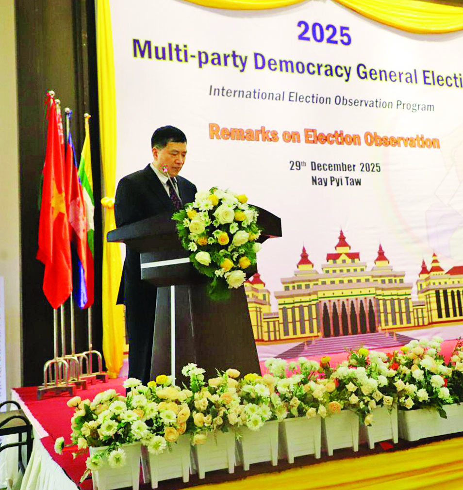 အထူးသဖြင့်ကတော့ ရွေးကောက်ပွဲတွေ ဖော်ဆောင်တယ်ဆိုတာ ကျွန်တော်တို့ သမ္မတကြီး ရှီကျင့်ဖျင်နဲ့ မြန်မာနိုင်ငံ ယာယီသမ္မတကြီး ဗိုလ်ချုပ်မှူးကြီး မင်းအောင်လှိုင်နဲ့ကြားမှာထားရှိတဲ့ သဘောတူညီမှု၊ တရုတ် - မြန်မာကြား ပူးပေါင်းဆောင်ရွက်မှုတွေကို အကောင်အထည်ဖော်ဆောင်ရွက်လျက်ရှိပါတယ်။ မြန်မာနိုင်ငံနဲ့ တရုတ်နိုင်ငံဟာဆိုရင် ပူးပေါင်းဆောင်ရွက်မှုတွေ များစွာလုပ်နေတာဖြစ်ပြီးတော့ တရုတ်နိုင်ငံအနေနဲ့ မြန်မာနိုင်ငံကိုလည်း ထောက်ပံ့ကူညီမှုတွေ များစွာ ပြုလုပ်လျက်ရှိပါတယ်။ မနေ့ကဆိုရင် နေပြည်တော်မှာရှိတဲ့ မဲရုံခြောက်ရုံကို သွားရောက်လေ့လာခဲ့ပါတယ်။ အဲ့လိုမျိုး သွားရောက်လေ့လာတဲ့အခါ ကျွန်တော့်အနေနဲ့ အကြမ်းဖျင်း အားဖြင့် အားလုံး ကောင်းမွန်အဆင်ပြေနေတာကို တွေ့ရပါတယ်ခင်ဗျာ။ ကျွန်တော့်အနေနဲ့ တွေ့ရှိ ချက်တွေကို ပြောရမယ်ဆိုရင် ပထမဆုံးအနေနဲ့ မဲရုံပြင်ဆင်ထားရှိမှုတွေက စနစ်ကျတယ်။ တက်ကြွ စွာပါဝင်နေတဲ့ မဲဆန္ဒရှင်တွေကိုလည်း တွေ့ရပါတယ်။ နောက်ဆုံး မဲရုံမှာ မဲရုံပိတ်ဖို့ တစ်နာရီခွဲ လောက်ပဲလိုတော့တာတောင် မဲပေးဖို့ စီတန်းစောင့်နေကြတာကို တွေ့ရတယ်။ ရွေးကောက်ပွဲမှာ တာဝန်ထမ်းဆောင်ကြတဲ့ ဝန်ထမ်းတွေကလည်း လုပ်ငန်းဆောင်ရွက်တာ မှန်ကန်တိကျ ကောင်းမွန်တာကို တွေ့ရပါတယ်။ မဲလာပေးတဲ့ ပြည်သူတွေရဲ့ ID ကတ်တွေနဲ့ သူတို့ရဲ့ အချက်အလက်တွေကို တိုက်ဆိုင်စစ်ဆေးနေတာ တွေ့ရပါတယ်။ စိတ်ရှည်လက်ရှည်နဲ့ လုပ်ငန်းဆောင်ရွက်နေကြတာကို တွေ့ရပါတယ်။ အခုကျင်းပတဲ့ ရွေးကောက်ပွဲအပိုင်း (၁) အဆင်ပြေချောမွေ့ပြီး တည်ငြိမ်အေးချမ်းနေ တာကို တွေ့ရပါတယ်။ အောင်မြင်တဲ့ ရွေးကောက်ပွဲဖြစ်တဲ့အတွက် နောင်ကျင်းပမယ့် အပိုင်း (၂) နဲ့ အပိုင်း (၃) မှာလည်း အောင်မြင်အောင် ဆောင်ရွက်နိုင်မယ်လို့ ယူဆပါတယ်။ မဲဆန္ဒရှင်တွေမှာ မျှော်မှန်းချက်တွေရှိတယ်ဆိုတာကိုလည်း တွေ့ခဲ့ရတယ်။ ရွေးကောက်ပွဲပြီးရင် သူတို့ဘဝတွေ ပိုကောင်းလာမယ်။ စီးပွားရေးတွေ ကောင်းလာမယ်။ အချို့နေရာတွေမှာ ပဋိပက္ခတွေ လျော့ကျသွားပြီး အေးချမ်းတည်ငြိမ်သွားမယ်။ ယခုရွေးကောက်ပွဲဟာ မြန်မာနိုင်ငံရဲ့ ပြည်တွင်းရေးကိစ္စဖြစ်ပြီး တရုတ်နိုင်ငံအနေနဲ့ အောင်မြင်တယ်လို့ ယူဆပါတယ်။ အမျိုးသားပြန်လည်စည်းလုံးညီညွတ်ရေး၊ အတူယှဉ်တွဲနေထိုင်ရေးတို့ကို အကောင်အထည်ဖော်ဆောင်ရွက်နိုင်လိမ့်မယ်လို့ ကျွန်တော်ယုံကြည်ပါတယ်။ တရုတ်နိုင်ငံနဲ့ မြန်မာနိုင်ငံဟာ ကောင်းမွန်တဲ့၊ ချစ်ကြည်ရင်းနှီးတဲ့ ဆက်ဆံရေးရှိသော နိုင်ငံတွေ ဖြစ်ကြပါတယ်။ ကျွန်တော်တို့အနေနဲ့ မြန်မာ ကို အမြဲတမ်းကူညီပေးဖို့ အသင့်ရှိနေပါတယ်။ နှစ်နိုင်ငံကြား ဖွံ့ဖြိုးတိုးတက်မှုတွေကို ရရှိအောင် ထူထောင်သွားဖို့အ
