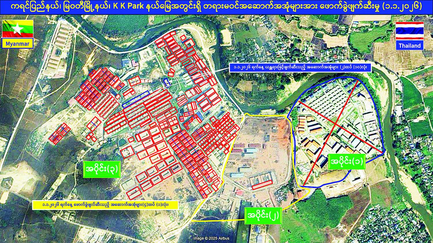 ယနေ့တွင် မြဝတီ - မဲ့ထော်သလေး(KK Park) အပိုင်း(၃)နယ်မြေအတွင်းရှိ အွန်လိုင်းလိမ်လည် လောင်းကစားမှုများ ကျူးလွန်ရာတွင် အသုံးပြုခဲ့သည့် တရားမဝင်လေးထပ်အဆောက် အအုံတစ်လုံး၊ နှစ်ထပ်အဆောက်အအုံ ၁၀ လုံး စုစုပေါင်းတရား မဝင်အဆောက်အအုံ ၁၁ လုံးတို့ကို ထပ်မံဖြိုချဖျက်ဆီးခဲ့သဖြင့် KK Park နယ်မြေအတွင်းရှိ တရားမဝင်အဆောက်အအုံ စုစုပေါင်း ၆၃၅ လုံး အနက် ၅၄၉ လုံးကို စနစ်တကျဖြိုချဖျက်ဆီးပြီးဖြစ်ကြောင်း သိရှိရသည်။