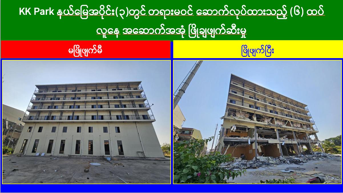 မြန်မာနိုင်ငံအစိုးရအနေဖြင့် အွန်လိုင်းလိမ်လည်လောင်းကစားမှုများ အများဆုံးအခြေချလုပ်ကိုင်လျက်ရှိကြသည့် ရွှေကုက္ကိုလ်နယ်မြေနှင့် KK Park နယ်မြေများရှိ တရားမဝင် အဆောက်အအုံများအတွင်း ဝင်ရောက်ရှင်းလင်း၍ အွန်လိုင်းလိမ်လည်လောင်းကစားမှုလုပ်ငန်းစဉ်များတွင် အသုံးပြုခဲ့သည့် သိမ်းဆည်းရမိပစ္စည်းများအား စနစ်တကျ ဖျက်ဆီးခြင်းနှင့် တရားမဝင်အဆောက်အအုံများအား စနစ်တကျဖြိုချဖျက်ဆီးခြင်းများကို အဖွဲ့စုံပါဝင်သည့် ပူးပေါင်းအဖွဲ့ဖြင့် ဆောင်ရွက်လျက်ရှိရာ ယနေ့တွင်လည်း KK Park နယ်မြေအတွင်းရှိ တရားမဝင်အဆောက်အအုံ ၆ လုံးကို ထပ်မံဖြိုချဖျက်ဆီးခဲ့ကြောင်း သိရှိရသည်။