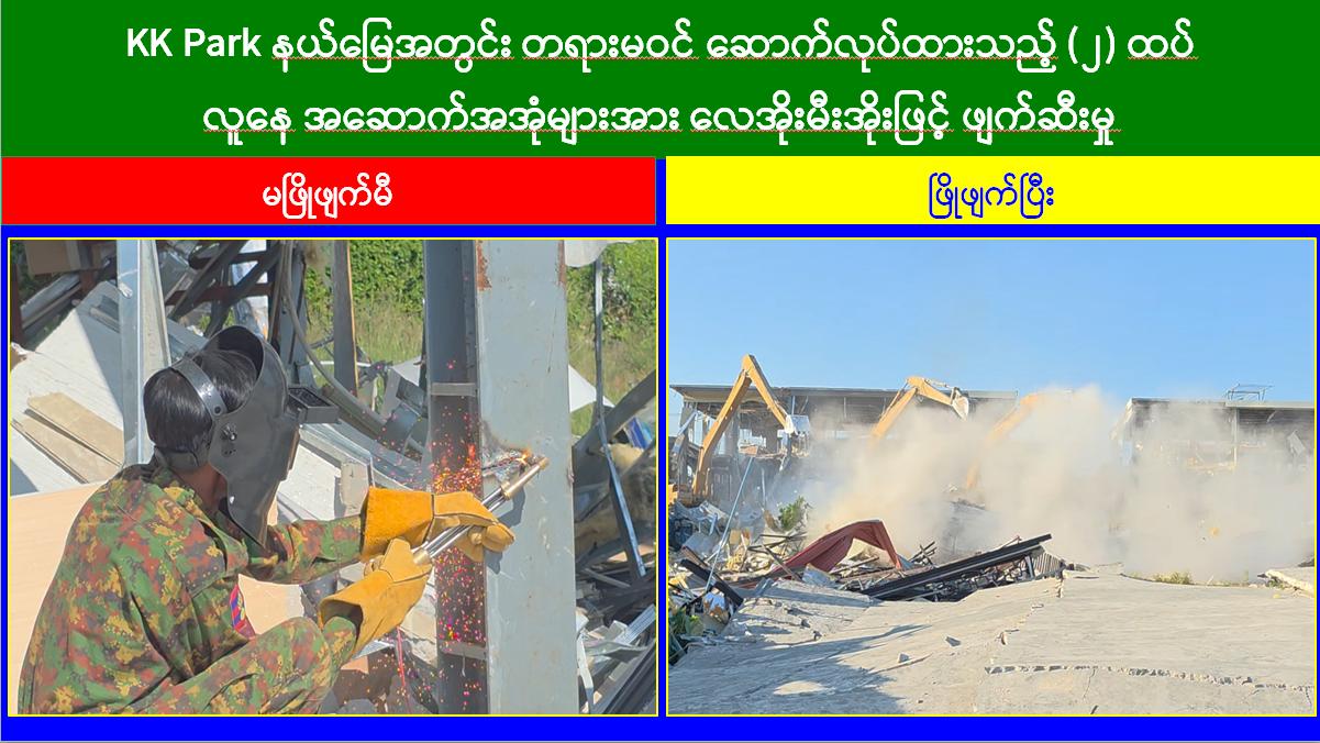 မြဝတီ-မဲထော်သလေး ယနေ့တွင် (KK Park) အပိုင်း (၃) နယ်မြေအတွင်းရှိ အွန်လိုင်းလိမ်လည်လောင်းကစားမှုများ ကျူးလွန်ရာတွင် အသုံးပြုခဲ့သည့် တရားမဝင် ၆ ထပ် အဆောက်အအုံ ၄ လုံးနှင့် အပိုင်း (၂) နယ်မြေအတွင်းရှိ အွန်လိုင်းလိမ်လည်လောင်းကစားမှုများ ကျူးလွန်ရာတွင် အသုံးပြုခဲ့သည့် တရားမဝင် ၄ ထပ် အဆောက်အအုံ ၂ လုံး၊ စုစုပေါင်း တရားမဝင် အဆောက်အအုံ ၆ လုံးတို့ကို ထပ်မံဖြိုချဖျက်ဆီးခဲ့သဖြင့် KK Park နယ်မြေအတွင်းရှိ တရားမဝင်အဆောက်အအုံ စုစုပေါင်း ၆၃၅ လုံး အနက် ၅၅၅ လုံးကို စနစ်တကျ ဖြိုချဖျက်ဆီးပြီးဖြစ်ကြောင်း သိရှိရသည်။