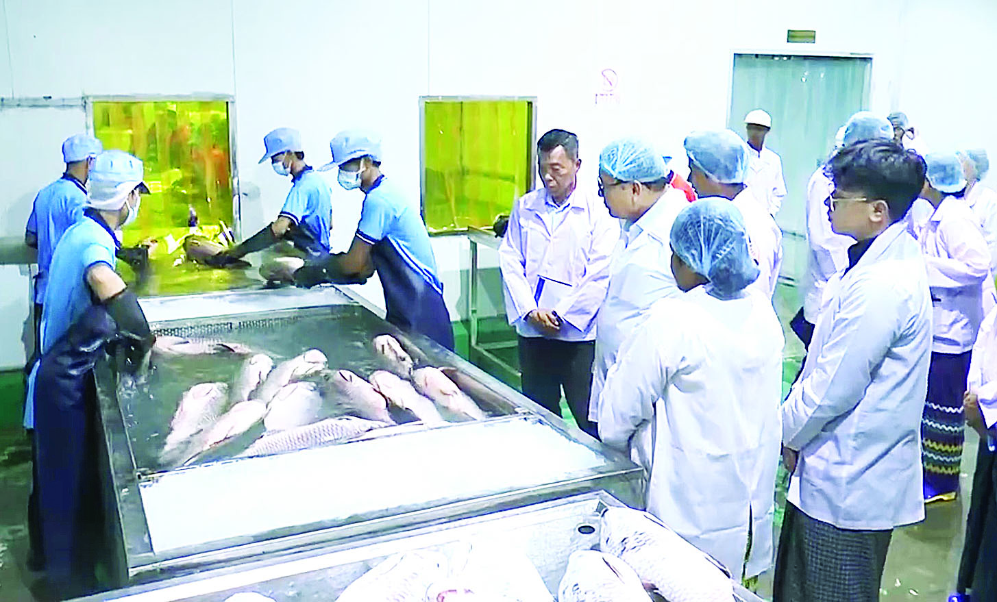 စိုက်ပျိုးရေး၊ မွေးမြူရေးနှင့် ဆည်မြောင်းဝန်ကြီးဌာန ဒုတိယဝန်ကြီး ဒေါက်တာအောင်ကြီးသည် ယမန်နေ့ မွန်းလွဲပိုင်းက ရန်ကုန်တိုင်းဒေသကြီး ဒဂုံမြို့သစ် (ဆိပ်ကမ်း) မြို့နယ်ရှိ L&Z Marine Food Products LTD (အအေးခန်းစက်ရုံ) သို့ ရောက်ရှိရာ စက်ရုံတာဝန်ရှိသူက တစ်နေ့လျှင် အအေးခဲထုတ်လုပ်နိုင်မှုပမာဏ ၂၅ တန်ရှိပြီး တန် ၁၅၀၀ ဆံ့ သိုလှောင်အအေးခန်းဖြင့် လုပ်ငန်း ဆောင်ရွက်နေမှုအခြေအနေ၊ စက်ရုံမှ အရည်အသွေးမြင့်ထုတ်ကုန်များကို သန့်ရှင်းစွာဖြင့် ထုတ်လုပ်နိုင်ရန်အတွက် ငါးလုပ်ငန်းဦးစီးဌာနမှ ဖွင့်လှစ်ထားသည့် သင်တန်းများ တက်ရောက် စေခြင်း၊ ညွှန်ကြားထားသည့် စည်းမျဉ်း စည်းကမ်းချက်များနှင့်အညီ ကုန်ထုတ်လုပ်မှု၊ သိုလှောင်မှု၊ တင်ပို့မှုလုပ်ငန်းစဉ်များ ဆောင်ရွက်လျက်ရှိပြီး စက်ရုံအနေဖြင့် EU၊ Saudi နိုင်ငံများသို့ တင်ပို့ရရှိမှုအတွက် ခွင့်ပြုချက် ရရှိထားပြီဖြစ်၍ ရေချိုငါး၊ ရေငန်ငါးမျိုးများအား အများဆုံးတင်ပို့ လျက်ရှိပါကြောင်းနှင့် နှစ်အလိုက် တင်ပို့မှု တန်ချိန်များအား ရှင်းလင်းတင်ပြရာ ဒုတိယဝန်ကြီးက လိုအပ်သည်များ မှာကြားသည်။