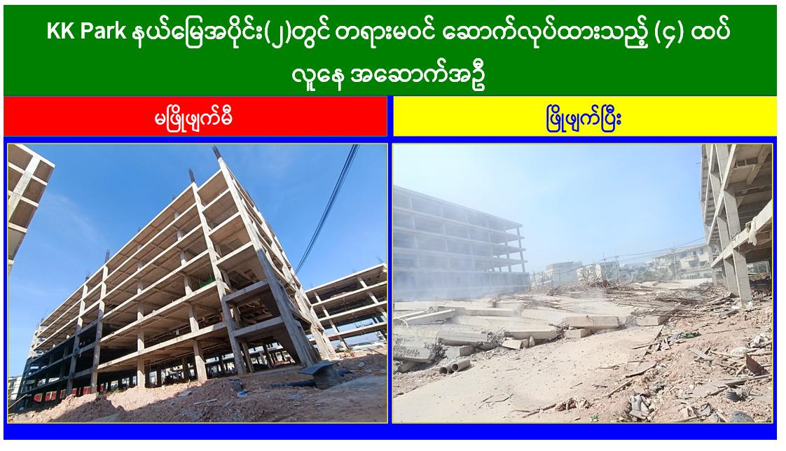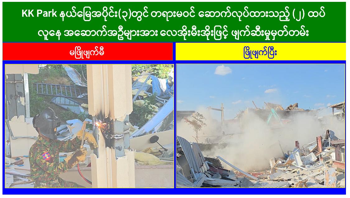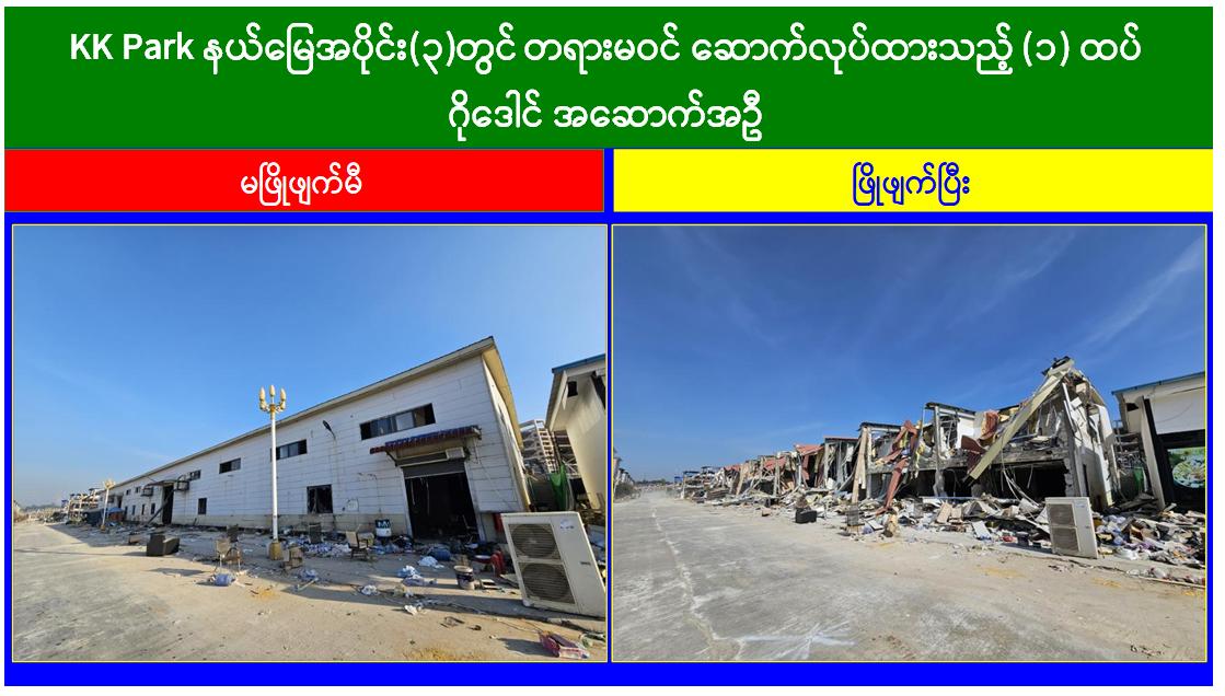 KK Park နယ်မြေအတွင်း အွန်လိုင်းလိမ်လည်လောင်းကစားမှုကျူးလွန်ရာတွင် အသုံးပြုသည့် တရားမဝင်အဆောက်အအုံ ၅၆၃ လုံး စနစ်တကျဖြိုချဖျက်ဆီးပြီးဖြစ်