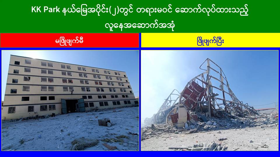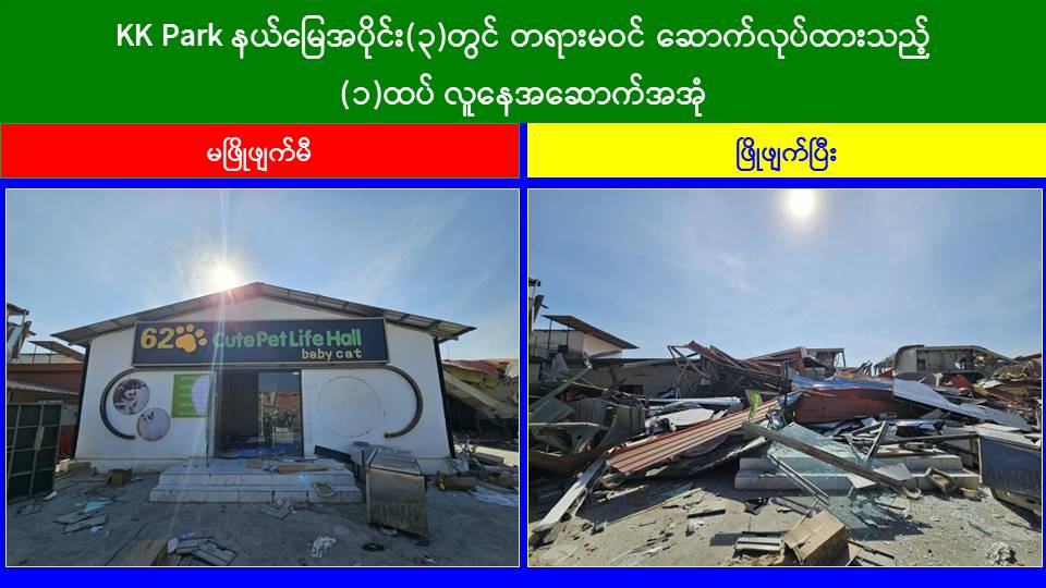 မြန်မာနိုင်ငံအစိုးရအနေဖြင့် အွန်လိုင်းလိမ်လည်လောင်းကစားမှုများ အများဆုံး အခြေချလုပ်ကိုင်လျက်ရှိကြသည့် ရွှေကုက္ကိုလ်နယ်မြေနှင့် KK Park နယ်မြေများရှိတရားမဝင် အဆောက်အအုံများအတွင်း ဝင်ရောက်ရှင်းလင်း၍ အွန်လိုင်းလိမ်လည် လောင်းကစားမှုလုပ်ငန်းစဉ်များတွင် အသုံးပြုခဲ့သည့် သိမ်းဆည်းရမိပစ္စည်းများအား စနစ်တကျဖျက်ဆီးခြင်းနှင့် တရားမဝင်အဆောက်အအုံများအား စနစ်တကျဖြိုချ ဖျက်ဆီးခြင်းများကို အဖွဲ့စုံပါဝင်သည့်ပူးပေါင်းအဖွဲ့ဖြင့် ဆောင်ရွက်လျက်ရှိရာ ယနေ့တွင်လည်း KK Park နယ်မြေအတွင်းရှိ တရားမဝင်အဆောက်အအုံ ၂၁ လုံးကို ထပ်မံဖြိုချဖျက်ဆီးခဲ့ကြောင်း သိရှိရသည်။