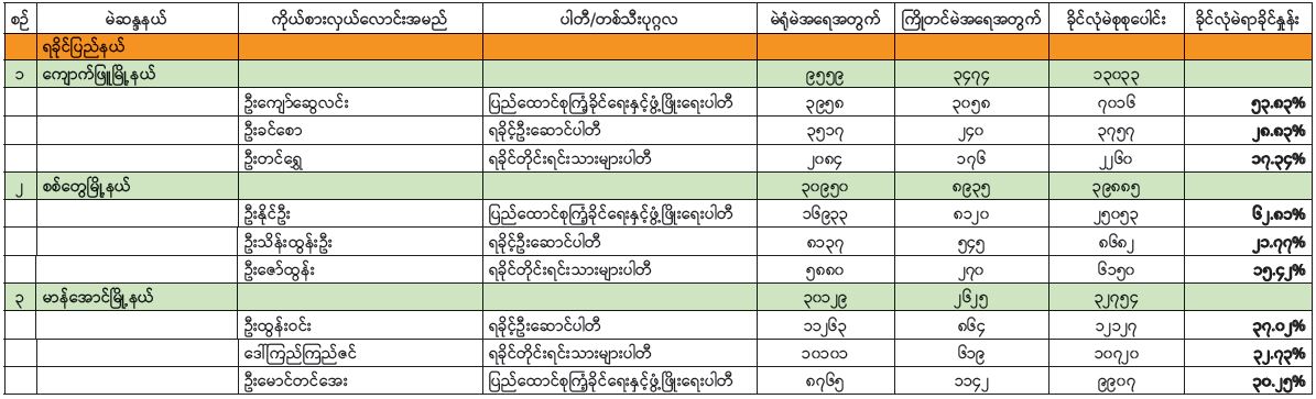 ၂၀၂၅ ခုနှစ် ပါတီစုံဒီမိုကရေစီအထွေထွေရွေးကောက်ပွဲအပိုင်း (၁) တိုင်းဒေသကြီးလွှတ်တော် သို့မဟုတ် ပြည်နယ်လွှတ်တော် (မဲအများဆုံးရသူအနိုင်ယူစနစ်) ကိုယ်စားလှယ်လောင်းတစ်ဦးချင်း ဆန္ဒမဲရရှိမှုအခြေအနေ 01/06/2026