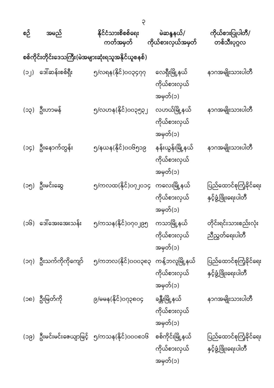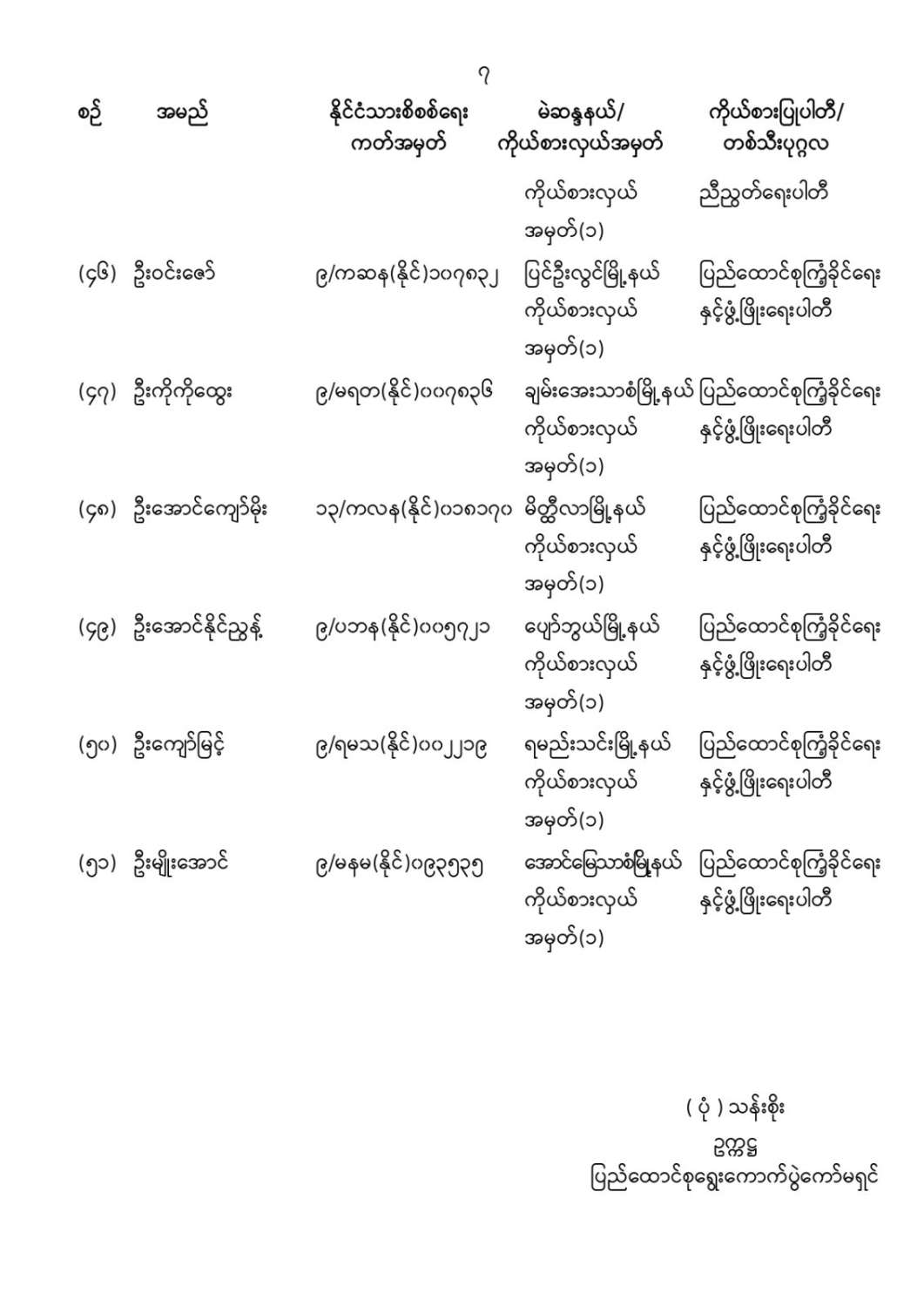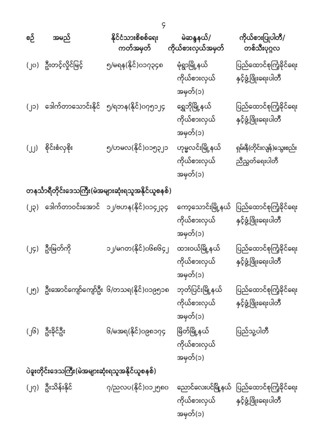ပြည်ထောင်စုသမ္မတမြန်မာနိုင်ငံတော် ပြည်ထောင်စုရွေးကောက်ပွဲကော်မရှင် ကြေညာချက်အမှတ် (၉/၂၀၂၆) ၁၃၈၇ ခုနှစ်၊ ပြာသိုလပြည့်ကျော် ၄ ရက် (၂၀၂၆ ခုနှစ်၊ ဇန်နဝါရီလ ၆ ရက်) တိုင်းဒေသကြီးလွှတ်တော် သို့မဟုတ် ပြည်နယ်လွှတ်တော်ကိုယ်စားလှယ်အဖြစ် ရွေးကောက်တင်မြှောက်ခံရသူများအမည်စာရင်းကြေညာခြင်း