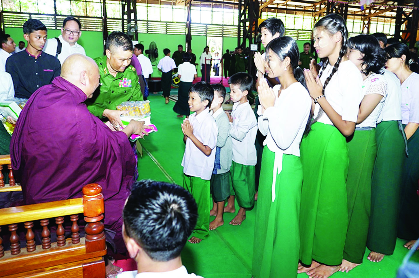 သဲဖြူ-မဟာမြိုင်-ချောင်းဖျားတောရ ဓမ္မရိပ်သာကြီး ၏ ဦးစီးပဓာနဆရာတော် ဒေါက်တာဘဒ္ဒန္တပညာ ဇောတကကမ်းရိုးတန်းဒေသ တိုင်းစစ်ဌာနချုပ်ရှိ ကျောင်းသား ကျောင်းသူများအား ကျောင်းဝတ်စုံနှင့် စာရေးကိရိယာများ ပေးအပ်လှူဒါန်းခြင်းကို ယနေ့နံနက်ပိုင်းတွင် တိုင်းစစ်ဌာနချုပ် တိုင်းရန်အောင်ခန်းမ၌ ပြုလုပ်ရာ သဲဖြူ-မဟာမြိုင်-ချောင်းဖျား တောရဓမ္မရိပ်သာကြီး၏ ဦးစီးပဓာနဆရာတော် ကြွရောက်တော်မူပြီးတိုင်းမှူး ဗိုလ်ချုပ် ကျော်ကျော်ဟန်နှင့် တာဝန်ရှိသူများ၊ အရာရှိ၊ စစ်သည်၊ မိသားစု ဝင်များနှင့် ကျောင်းသား ကျောင်းသူများ တက်ရောက်ကြသည်။