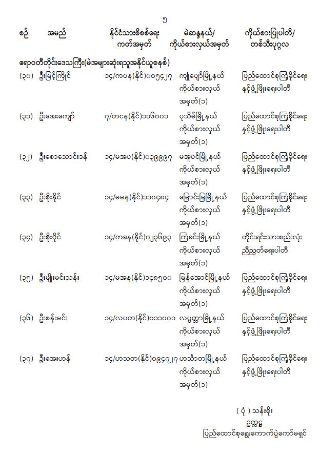 တိုင်းဒေသကြီးလွှတ်တော် သို့မဟုတ် ပြည်နယ်လွှတ်တော်ကိုယ်စားလှယ်အဖြစ် ရွေးကောက်တင်မြှောက်ခံရသူများအမည်စာရင်း ကြေညာခြင်း 01/08/2026