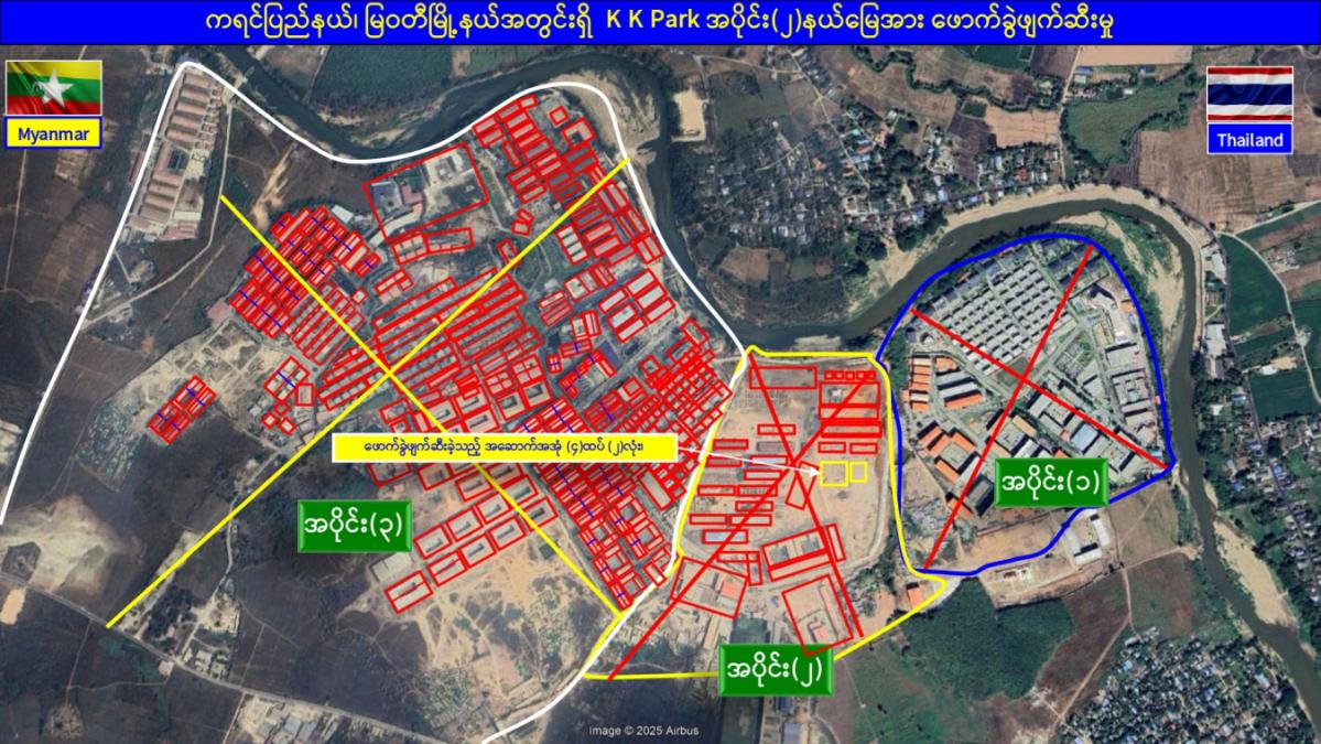 ယနေ့တွင် မြဝတီ-မဲထော်သလေး (KK Park) အပိုင်း(၂) နယ်မြေအတွင်းရှိတရားမဝင် အဆောက်အအုံ ၆၂ လုံးရှိရာ ယနေ့တွင် နောက်ဆုံးကျန်ရှိသည့် တရားမဝင် ၄ ထပ်အဆောက်အအုံ ၂ လုံးကို ထပ်မံဖြိုချဖျက်ဆီးခဲ့သည်။ သို့ဖြစ်၍ KK Park နယ်မြေ အတွင်းရှိ အွန်လိုင်းလိမ်လည်လောင်းကစားမှုများကျူးလွန်ရာတွင် အသုံးပြုသည့် အပိုင်း (၁)နယ်မြေမှ တရားမဝင်အဆောက်အအုံ ၁၄၈ လုံး၊ အပိုင်း (၂) နယ်မြေမှ တရားမဝင်အဆောက်အအုံ ၆၂ လုံးနှင့် အပိုင်း(၃)နယ်မြေမှ တရားမဝင်အဆောက်အအုံ ၄၂၅ လုံး၊ စုစုပေါင်း ၆၃၅ လုံးတို့ကို ဖောက်ခွဲဖျက်ဆီး၍သော်လည်းကောင်း၊ ယာဉ်ယန္တရားများ အသုံးပြု၍သော်လည်းကောင်း ရာနှုန်းပြည့်ဖြိုချဖျက်ဆီးပြီးဖြစ်ကြောင်း သိရှိရသည်။