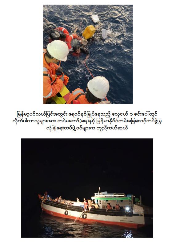 ရန်ကုန်တိုင်းဒေသကြီး၊ ရန်ကုန်မြို့၏ တောင်ဘက် ရေမိုင် ၁၅၆ မိုင်ခန့်အကွာရှိ မြန်မာ့ပင်လယ်ပြင်အတွင်း ရေဝင်နစ်မြုပ်နေသည့် လှေတစ်စင်းပေါ်မှ လိုက်ပါလာသူများအား တပ်မတော် (ရေ) နှင့် မြန်မာနိုင်ငံကမ်းခြေစောင့်တပ်ဖွဲ့မှ လုံခြုံရေးတပ်ဖွဲ့ဝင်များက ကူညီကယ်ဆယ်ရေးလုပ်ငန်းများ ဆောင်ရွက်ပေးခဲ့ကြောင်း သိရှိရသည်။
