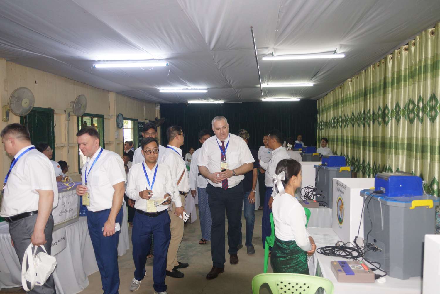 နိုင်ငံတကာရွေးကောက်ပွဲ စောင့်ကြည့်လေ့လာရေးအဖွဲ့များဖြစ်သည့် ဘယ်လာရုစ်သမ္မတနိုင်ငံမှ ကိုယ်စားလှယ်အဖွဲ့၊ ကမ္ဘောဒီးယားနိုင်ငံရွေးကောက်ပွဲကော်မရှင်မှကိုယ်စားလှယ်အဖွဲ့၊ နီပေါနိုင်ငံရွေးကောက်ပွဲကော်မရှင်မှကိုယ်စားလှယ်အဖွဲ့၊ အင်ဒိုနီးရှားနိုင်ငံ ရွေးကောက်ပွဲကော်မရှင်မှကိုယ်စားလှယ်အဖွဲ့၊ ဗီယက်နမ်ဆိုရှယ်လစ်သမ္မတနိုင်ငံမှကိုယ်စားလှယ်အဖွဲ့၊ နီကာရာဂွါနိုင်ငံမှ ကိုယ်စားလှယ်အဖွဲ့၊ အိန္ဒိယနိုင်ငံမှကိုယ်စားလှယ်နှင့် International Conference of Asian Political Parties(ICAPP)အဖွဲ့မှ ကိုယ်စားလှယ်များသည် ပြည်ထောင်စုရွေးကောက်ပွဲကော်မရှင်ရုံးမှ တာဝန်ရှိသူများ၊ ရန်ကုန်တိုင်းဒေသကြီး ရွေးကောက်ပွဲကော်မရှင်အဖွဲ့ခွဲမှ တာဝန်ရှိသူများက  ဒဂုံမြို့နယ်ပြည်လမ်း(အရှေ့)ရပ်ကွက်ရှိမဲရုံအမှတ်(၂)၊ လမ်းမတော်မြို့နယ်အမှတ်(၈)ရပ်ကွက်ရှိမဲရုံအမှတ်(၁)၊ သာကေတမြို့နယ် အမှတ်(၇)ရပ်ကွက်(အနောက်)ရှိ မဲရုံအမှတ်(၁)၊ မဲရုံအမှတ်(၂)နှင့် မဲရုံအမှတ်(၃)များသို့ရောက်ရှိပြီး မဲဆန္ဒရှင်ပြည်သူများ လွတ်လပ်စွာဆန္ဒမဲပေးနေမှု၊ မဲရုံတာဝန်ရှိသူများမှ ပြည်သူများအဆင်ပြေစွာ ဆန္ဒမဲပေးနိုင်ရေး ကူညီဆောင်ရွက်ပေးနေမှုများကို လေ့လာကြည့်ရှုပြီး မဲရုံတာဝန်ထမ်းဆောင်ကြသူများနှင့် လွတ်လပ်စွာဆန္ဒမဲလာရောက်ပေးလျက်ရှိသော ပြည်သူများအားတွေ့ဆုံ၍ သိရှိလိုသည်များကို ဆွေးနွေးမေးမြန်းခဲ့ကြကြောင်းသိရသည်။