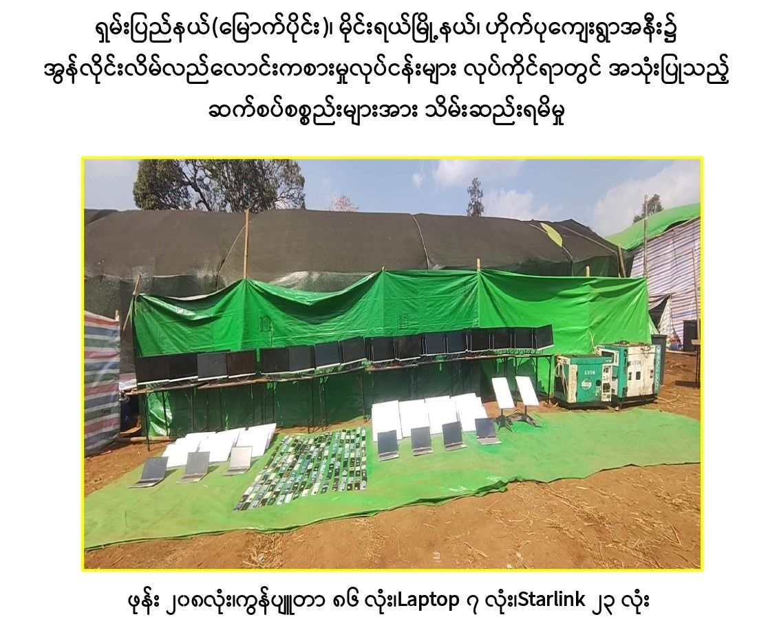 ထိုသို့ ဆောင်ရွက်လျက်ရှိရာ ရှမ်းပြည်နယ်(မြောက်ပိုင်း)၊ မိုင်းရယ်မြို့နယ်အတွင်း အွန်လိုင်းလိမ်လည်လောင်းကစားမှုလုပ်ငန်းများ အခြေပြုလုပ်ကိုင်နေသည်ကြောင်း တာဝန်သိပြည်သူများ၏ သတင်းပေးပို့မှုအရ လုံခြုံရေးတပ်ဖွဲ့ဝင်များပါဝင်သော ပူးပေါင်းအဖွဲ့များက လိုအပ်သည့် လေကြောင်းကင်းထောက်ခြင်း၊ မြေပြင်သတင်းစုံစမ်းဖော်ထုတ်ခြင်းနှင့် နယ်မြေရှင်းလင်းခြင်းများကို ဆောင်ရွက်ခဲ့ရာ ယနေ့နံနက် ၇ နာရီ ခန့်တွင် မိုင်းရယ်မြို့၏ အရှေ့တောင်ဘက် ၃၅ ကီလိုမီတာခန့်အကွာ ဟိုက်ပုကျေးရွာအနီးသို့အရောက်၌ မသင်္ကာဖွယ်ရာအဆောက်အအုံများကို တွေ့ရှိရသဖြင့် ဝင်ရောက်ရှာဖွေစစ်ဆေးခဲ့ရာ အွန်လိုင်းငွေကြေးလိမ်လည်မှုနှင့် လောင်းကစားမှုများ လုပ်ဆောင်နေသည့်နေရာဖြစ်ကြောင်း တွေ့ရှိရပြီး အွန်လိုင်းလိမ်လည် လောင်းကစားမှုများ လုပ်ကိုင်နေကြသူများဖြစ်သည့် တရုတ်နိုင်ငံသား အမျိုးသား ၃၂၁ ဦး၊ အမျိုးသမီး ၉ ဦး၊ စုစုပေါင်း ၃၃၀ ဦးတို့နှင့်အတူ မိုးကာအစိမ်းစများဖြင့် ဆောက်လုပ်ထားသည့် အဆောက်အအုံ ၁၅ လုံး၊ ဆောက်လုပ်ဆဲအဆောက်အအုံ ၁၀ လုံး၊ အွန်လိုင်းလိမ်လည်မှုများ လုပ်ဆောင်ရာတွင်အသုံးပြုသည့် မီးစက် ၂ လုံး၊ ဖုန်းမျိုးစုံ ၂၀၈ လုံး၊ ALL-IN-ONE ကွန်ပျူတာ ၈၆ လုံး၊ LAPTOP ၇ လုံး၊ STAR LINK ၂၃ လုံး၊ မော်တော်ယာဉ်မျိုးစုံ ၁၀ စီးတို့ကို တွေ့ရှိဖမ်းဆီးထိန်းသိမ်းနိုင်ခဲ့ကြောင်း သိရှိရသည်။