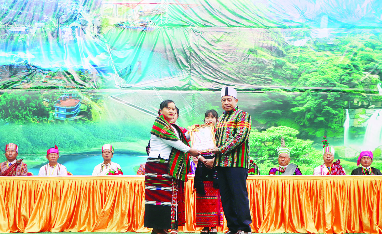 ဦးစွာ (၇၈) နှစ်မြောက် ချင်းအမျိုးသားနေ့အခမ်းအနားမုခ်ဦးကို နိုင်ငံတော်လုံခြုံရေးနှင့်အေးချမ်းသာယာရေးကော်မရှင်အဖွဲ့ဝင် ပြည်ထောင်စုဝန်ကြီး ဒုတိယဗိုလ်ချုပ်ကြီး ရာပြည့်၊ ပြည်ထောင်စုဝန်ကြီး ဦးမောင်မောင်တင့်နှင့် ဒေါက်တာချာလီသန်း၊ ပြည်နယ်ဝန်ကြီးချုပ်နှင့် ဒုတိယဝန်ကြီး ဦးရဲတင့်တို့က ဖဲကြိုးဖြတ်ဖွင့်လှစ်ပေးကြပြီး နိုင်ငံတော်လုံခြုံရေးနှင့်အေးချမ်းသာယာရေးကော်မရှင်အဖွဲ့ဝင် ပြည်ထောင်စုဝန်ကြီး ဒုတိယဗိုလ်ချုပ်ကြီး ရာပြည့်က ဘင်ခရာအဖွဲ့နှင့် ပန်းဖွားအဖွဲ့တို့ကို ဆုငွေများ ပေးအပ်ချီးမြှင့်သည်။