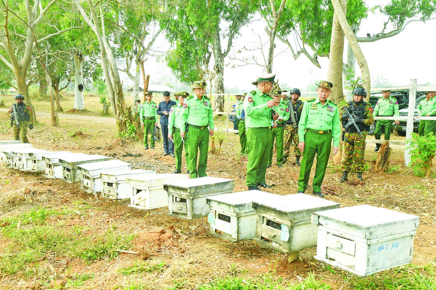 ထို့နောက် နိုင်ငံတော်လုံခြုံရေးနှင့် အေးချမ်းသာယာရေးကော်မရှင် ဒုတိယဥက္ကဋ္ဌ ဒုတိယတပ်မတော်ကာကွယ်ရေးဦးစီးချုပ်၊ ကာကွယ်ရေးဦးစီးချုပ်(ကြည်း)နှင့် အဖွဲ့ဝင်များသည် တိရစ္ဆာန်မွေးမြူရေးနှင့် လေ့ကျင့်ရေးတပ်ရင်းရှိ စံပြစိုက်ပျိုးမွေးမြူရေးဇုန်အတွင်း မြေစိုက်ရေခံအဆောက်အအုံနှင့် လေလုံအအေးပေးအဆောက်အအုံအတွင်း ဥစားကြက်များ မွေးမြူထားရှိမှု၊ Al သားစပ်ခြင်းမှ DYL မျိုးမြင့် သားပေါက်ဝက်များ၊ မျိုးမြင့်ဝက်သိုးနှင့် နို့စားနွားများ မွေးမြူထားရှိမှု၊ နေကြာပန်းများဝန်မှုံကူးမှု လွယ်ကူအဆင်ပြေစေရန်အတွက် ဆီနေကြာနှင့် ပျားအိမ်များ ယှဉ်တွဲစိုက်ပျိုးမွေးမြူထားရှိရာ အောင်မြင်ဖြစ်ထွန်းနေမှု၊ Green House အတွင်း ရာသီသီးနှံများ စိုက်ပျိုးထားရှိမှု၊ မျိုးစေ့ထုတ်ပိုးခန်းအတွင်း ရွှေဖရုံ၊ ဗူး၊ တိုင်ထောင်ပဲ၊ ငရုတ်၊ ရုံးပတီ၊ မုန့်ညင်းနှင့် ခရမ်းများကို မျိုးကောင်းမျိုးသန့်များအဖြစ် အဆင့်ဆင့်မျိုးစေ့များ ထုတ်ပိုးနေမှုနှင့် သိုလှောင်ခန်းအတွင်း မျိုးစေ့များ သိုလှောင်ထားရှိမှု၊ ကျောက်စိမ်း၊ တစ်သျှူး၊ သီးမွှေးငှက်ပျောစိုက်ပျိုးထားရှိမှုများ၊ မျိုးစေ့များ ခင်းကျင်းပြသထားရှိမှု၊ လား/မြင်းချေးမှ သဘာဝမြေဆွေး စမ်းသပ်ထုတ်လုပ်ထားရှိမှုများ၊ ရောဂါကာကွယ်ဆေးများ၊ ထောက်ပံ့နှင့် ပို့ဆောင်ရေးညွှန်ကြားရေးမှူးရုံး ကွပ်ကဲမှုအောက် အစာစပ်စက်ရုံမှ ထုတ်လုပ်သည့် တိရစ္ဆာန်အစားအစာများ ခင်းကျင်းပြသထားရှိမှု၊ ဗထူးစမ်းမှ ဆိုလာရေတင်စနစ်ဖြင့် စိုက်ပျိုးထားသည့် နေကြာ ၁၀ ဧကမှ နေကြာဆီများ ထုတ်လုပ်အောင်မြင်ဖြစ်ထွန်းနေမှုများကို လိုက်လံကြည့်ရှုစစ်ဆေးပြီး သိရှိလိုသည်များကို မေးမြန်းဆွေးနွေးကာ လိုအပ်သည်များအား တာဝန်ရှိသူများနှင့်အတူ ပေါင်းစပ်ညှိနှိုင်းဆောင်ရွက်ပေးသည်။