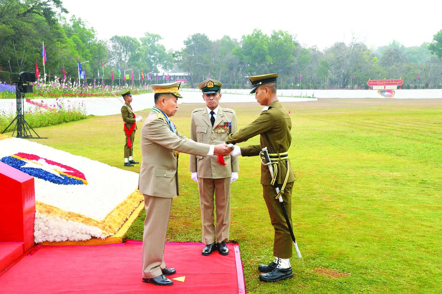 ထို့နောက် နိုင်ငံတော်လုံခြုံရေးနှင့်အေးချမ်းသာယာရေးကော်မရှင် ဒုတိယဥက္ကဋ္ဌ ဒုတိယတပ်မတော်ကာကွယ်ရေးဦးစီးချုပ် ကာကွယ်ရေးဦးစီးချုပ် (ကြည်း) ဒုတိယဗိုလ်ချုပ်မှူးကြီး သီရိပျံချီ မဟာသရေစည်သူ စိုးဝင်းသည် ဗိုလ်လောင်းတပ်ခွဲများ၏ အလေးပြုခြင်းကိုခံယူပြီးနောက် စစ်ရေးပြအခမ်းအနားမှ ပြန်လည်ထွက်ခွာသည်။