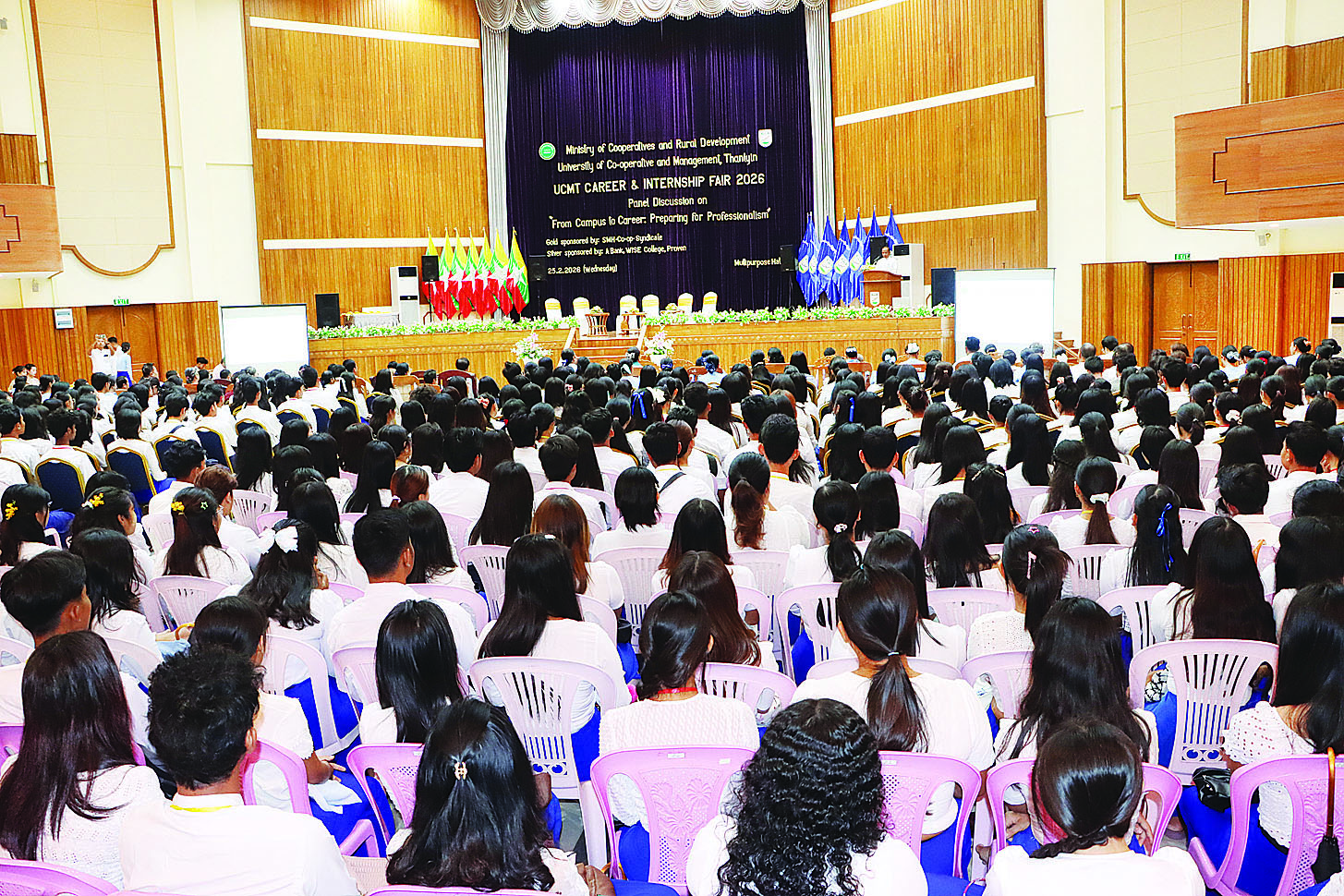 ယင်းနောက် UMFCCI မှ Secretary General ဒေါ်ခိုင်ခိုင်နွယ်က Moderator အဖြစ်ဆောင်ရွက်ပြီး ပါမောက္ခချုပ် ဒေါက်တာရီရီဝင်း၊ အငြိမ်းစားပါမောက္ခချုပ် ဒေါက်တာသိန်းထွန်း၊ သီရိသုဓမ္မသိင်္ဂီ ဒေါ်စန်း စန်းရီ၊ ဦးရဲမြင့်အောင်၊ ဒေါက်တာခင်ဆွေအေးတို့က “From Campus to Career: Preparing for Professionalism” ခေါင်းစဉ်ဖြင့် ဆွေးနွေးမှုနှင့် တက်ရောက်လာကြသည့် ကျောင်းသား ကျောင်းသူများနှင့် ဧည့်သည်တော်များ၏ သိရှိလိုသည်များ ဆွေးနွေးဖြေကြားမှုများကို ကြည့်ရှုအားပေးသည်။