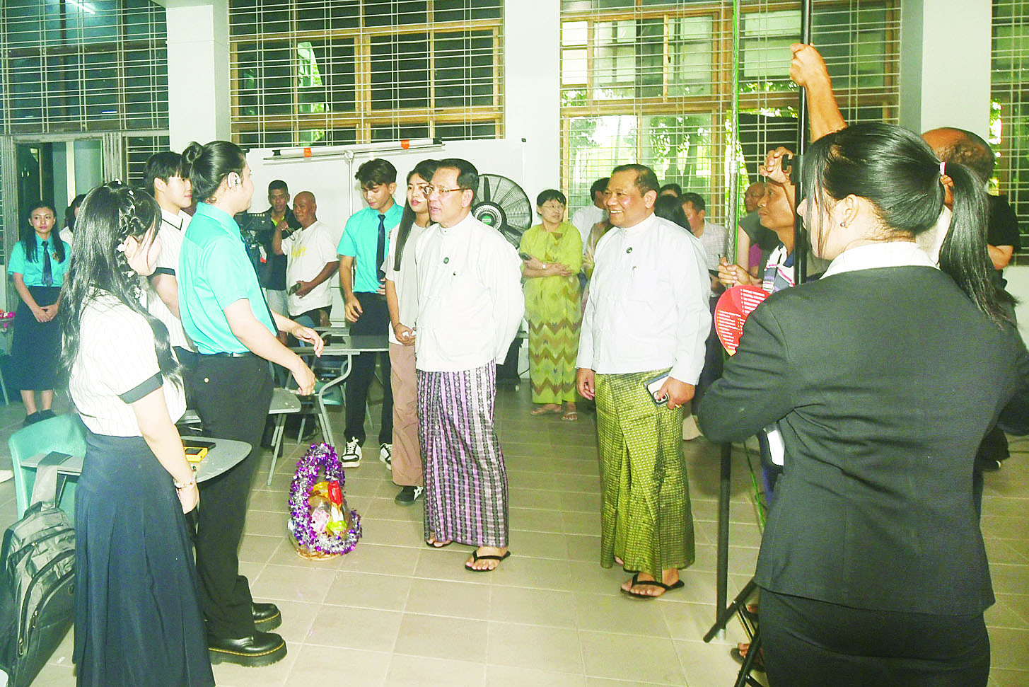 ဦးစွာ ပြည်ထောင်စုဝန်ကြီးသည် စာသင်ခန်းမအတွင်း၌ ဆရာနှင့် တပည့်ကျောင်းသား ကျောင်းသူများ ဆွေးနွေးခန်းရိုက်ကူးနေမှုကို ကြည့်ရှုအားပေးပြီး အဆိုပါ အနုပညာရှင်များအား ရင်းရင်းနှီးနှီးနှုတ်ဆက်ကာ ဂုဏ်ပြုသစ်သီးခြင်းပေးအပ်သည်။
