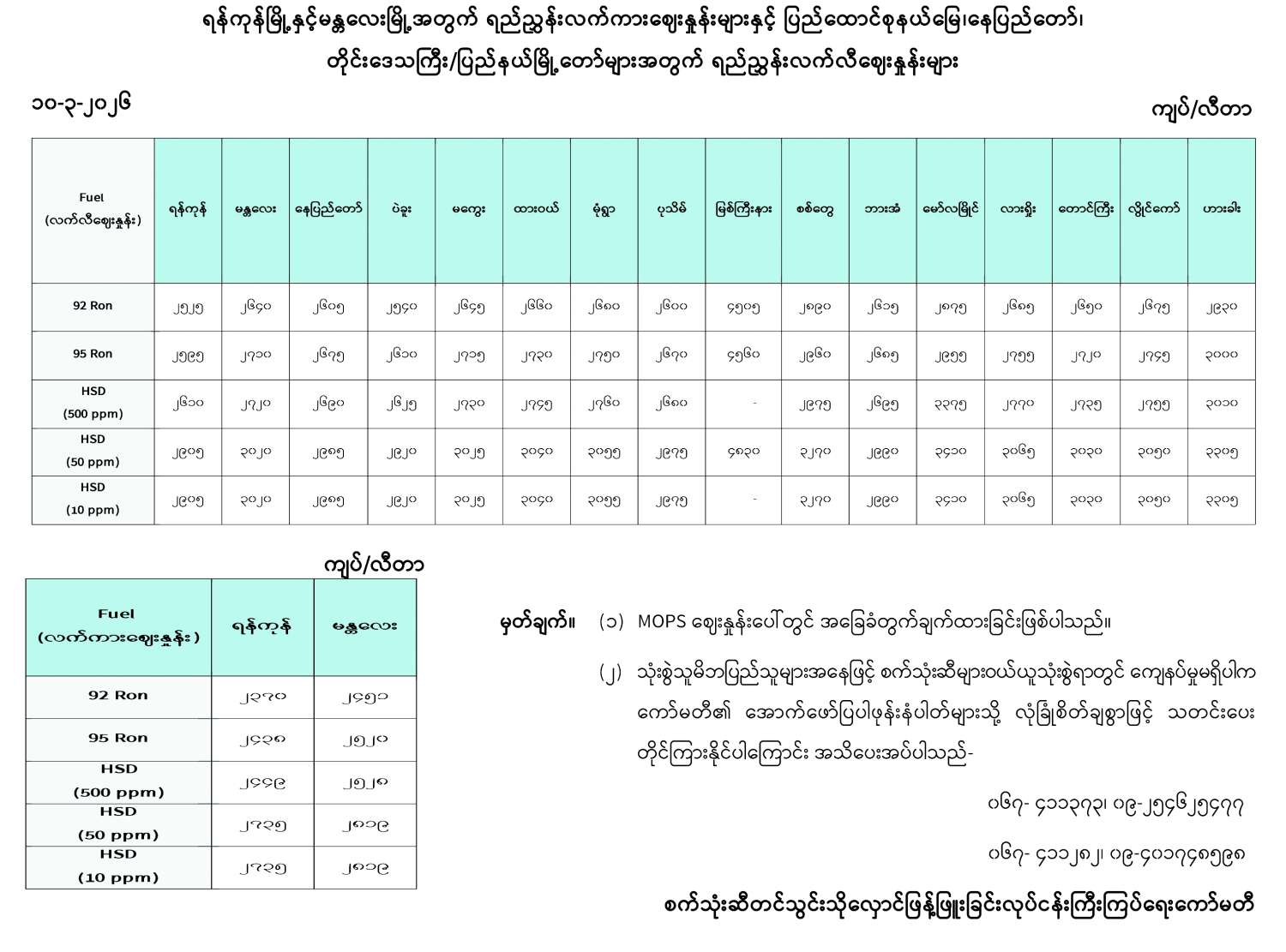 ရန်ကုန်မြို့နှင့် မန္တလေးမြို့အတွက် ရည်ညွှန်းလက်ကားဈေးနှုန်းများနှင့် ပြည်ထောင်စုနယ်မြေ နေပြည်တော်၊ တိုင်းဒေသကြီး/ပြည်နယ် မြို့တော်များအတွက် ရည်ညွှန်းလက်လီဈေးနှုန်းများ 03/10/2026