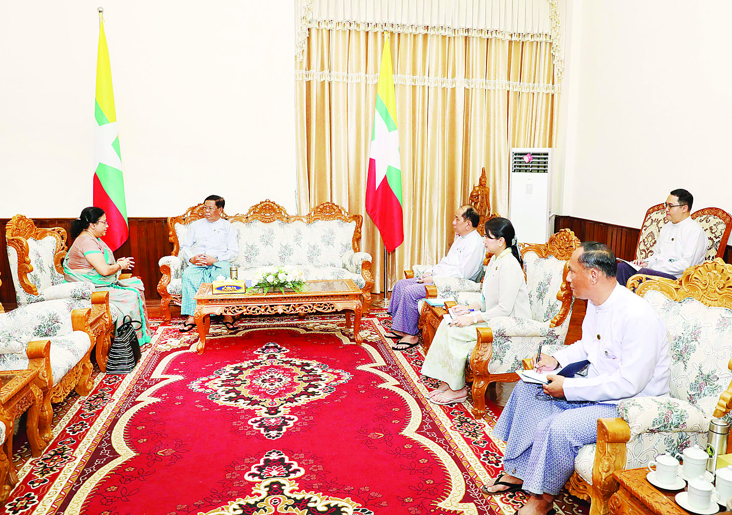 တွေ့ဆုံစဉ် နှစ်နိုင်ငံဆက်ဆံရေးပိုမိုမြှင့်တင်ရေး၊ နှစ်နိုင်ငံအကြား ဘုံအကျိုးစီးပွားဖြစ်ထွန်းစေမည့် နယ်ပယ်များ၊ ဒေသတွင်းနှင့် နိုင်ငံတကာမျက်နှာစာများတွင် ပူးပေါင်းဆောင်ရွက်ရေးဆိုင်ရာ ကိစ္စရပ်များနှင့်စပ်လျဉ်း၍ အမြင်ချင်းဖလှယ်ဆွေးနွေး ကြသည်။