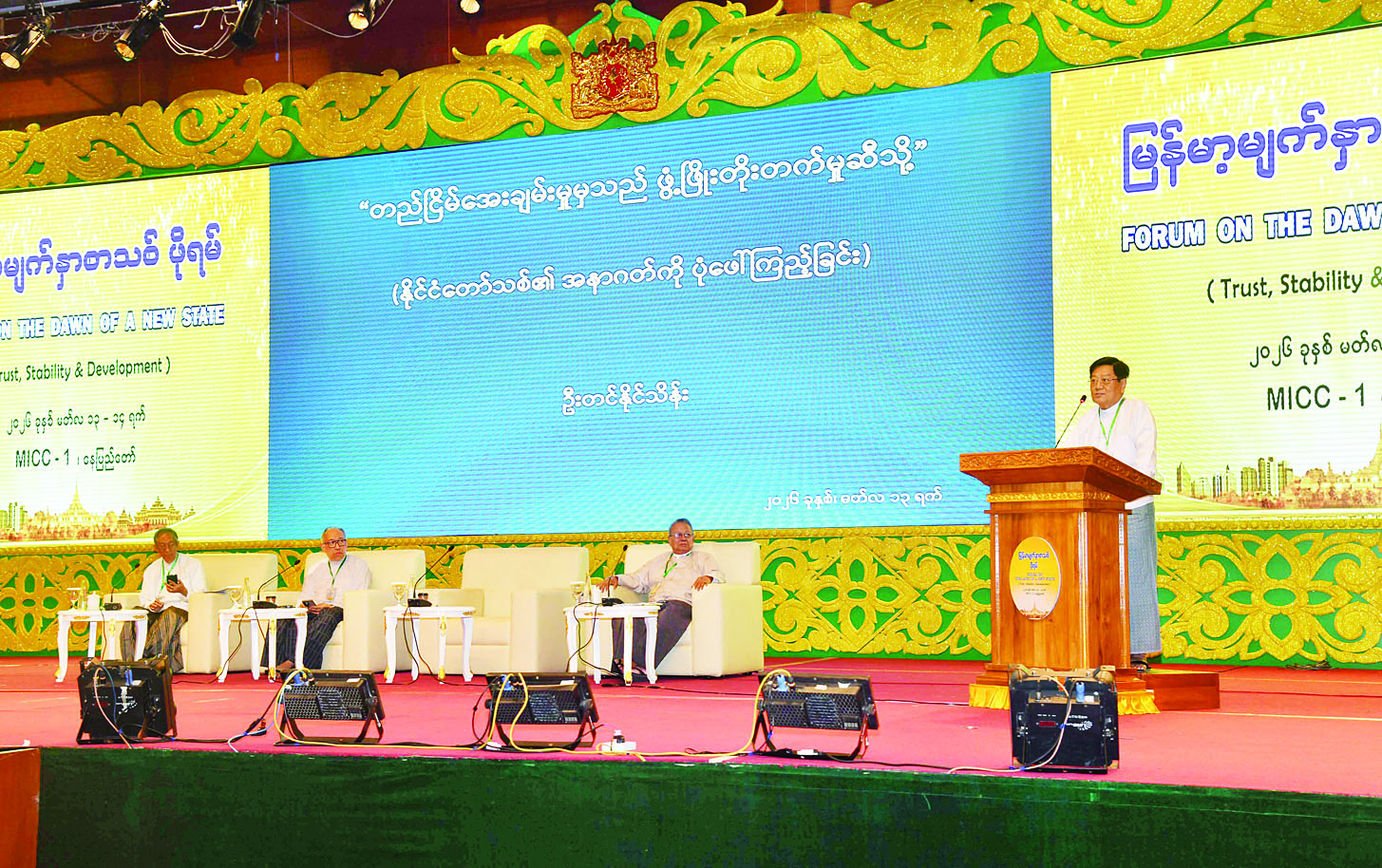 “မြန်မာ့မျက်နှာစာသစ်ဖိုရမ်” (ယုံကြည်မှု၊ တည်ငြိမ်အေးချမ်းမှုနှင့် ဖွံ့ဖြိုးတိုးတက်မှု) “Forum on The Dawn of A New State”(Trust, Stability & Development) ပထမနေ့ကို ယနေ့တွင် နေပြည်တော်ရှိ မြန်မာအပြည်ပြည်ဆိုင်ရာကွန်ဗင်းရှင်းဗဟိုဌာန (၁) (MICC I) ၌ ကျင်းပသည်။