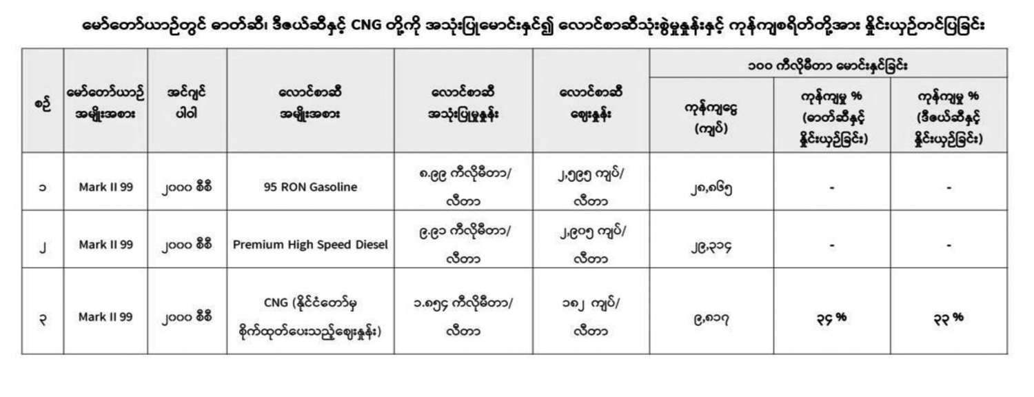 အများပြည်သူသယ်ယူပို့ဆောင်ရေးကဏ္ဍ အဆင်ပြေချောမွေ့စေရန် ရည်ရွယ်၍ မော်တော်ယာဉ်သုံးသဘာဝဓာတ်ငွေ့ (CNG) ကို ဈေးနှုန်းသက်သာစွာ ဝယ်ယူခွင့်ရရှိနေသော မော်တော်ယာဉ်များအနေဖြင့် ပြည်သူများအတွက် အကျိုးရှိထိရောက်စွာ ဝန်ဆောင်မှုပေးနိုင်ရေး စီမံဆောင်ရွက်