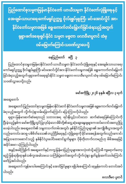 ပြည်ထောင်စုသမ္မတမြန်မာနိုင်ငံတော် ယာယီသမ္မတ နိုင်ငံတော်လုံခြုံရေးနှင့် အေးချမ်းသာယာရေးကော်မရှင်ဥက္ကဋ္ဌ ဗိုလ်ချုပ်မှူးကြီး မင်းအောင်လှိုင်အား နိုင်ငံတော်သမ္မတအဖြစ် ရွေးကောက်တင်မြှောက်ခြင်းခံရသည့်အတွက် ရုရှားဖက်ဒရေးရှင်းနိုင်ငံ သမ္မတ မစ္စတာ ဗလာဒီမာပူတင် ထံမှ ဝမ်းမြောက်ကြောင်းသဝဏ်လွှာပေးပို့