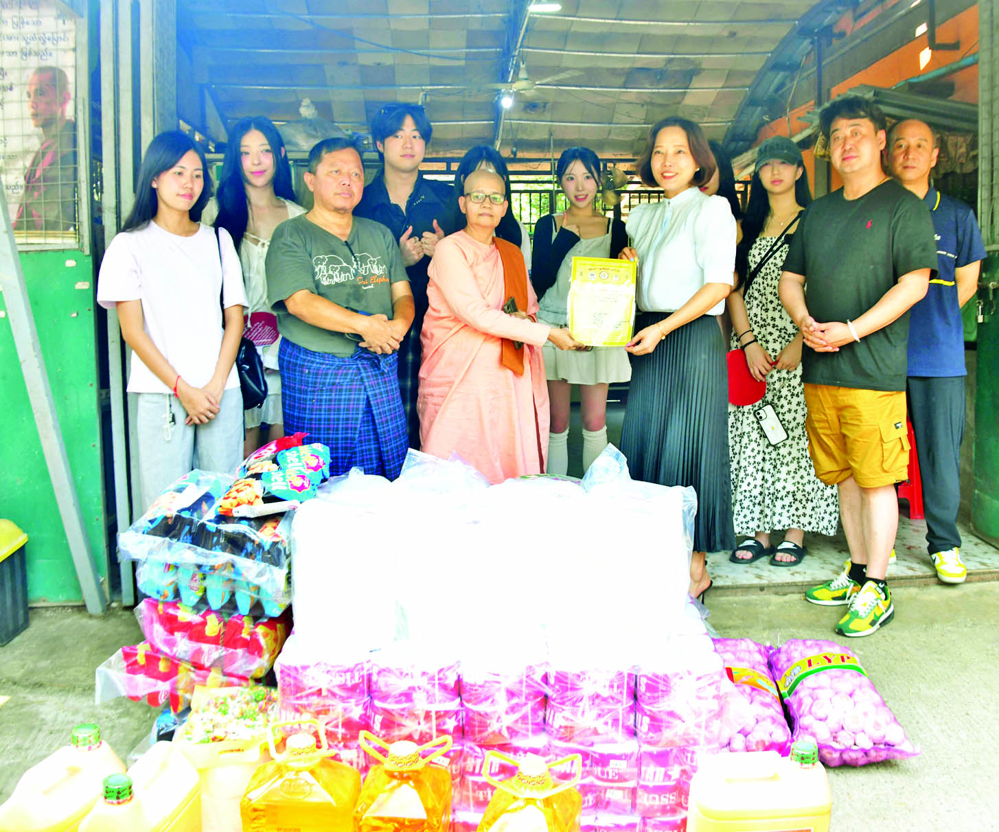အဆိုပါအဖွဲ့သည် နံနက်ပိုင်းတွင် ရန်ကုန်မြို့ မင်းဓမ္မကုန်းရှိ လောကချမ်းသာ အဘယလာဘမုနိ ဗုဒ္ဓရုပ်ပွားတော်မြတ်ကြီးသို့ သွားရောက်ဖူးမြော်ကြည်ညိုလေ့လာပြီး ရန်ကုန်မြို့တွင်းရှိ အထင်ကရနေရာများအား လှည့်လည်ကြည့်ရှု လေ့လာကြသည်။ မွန်းလွဲပိုင်းတွင် အနုပညာရှင်များက သန်လျင်မြို့နယ်ရှိ သဘာဝတရားရိပ်သာသို့ ဆန်၊ ဆီ၊ ကြက်သွန်၊ ကြက်ဥနှင့် မုန့်မျိုးစုံ တို့ကို သွားရောက်လှူဒါန်းခဲ့ကြကြောင်း သိရသည်။