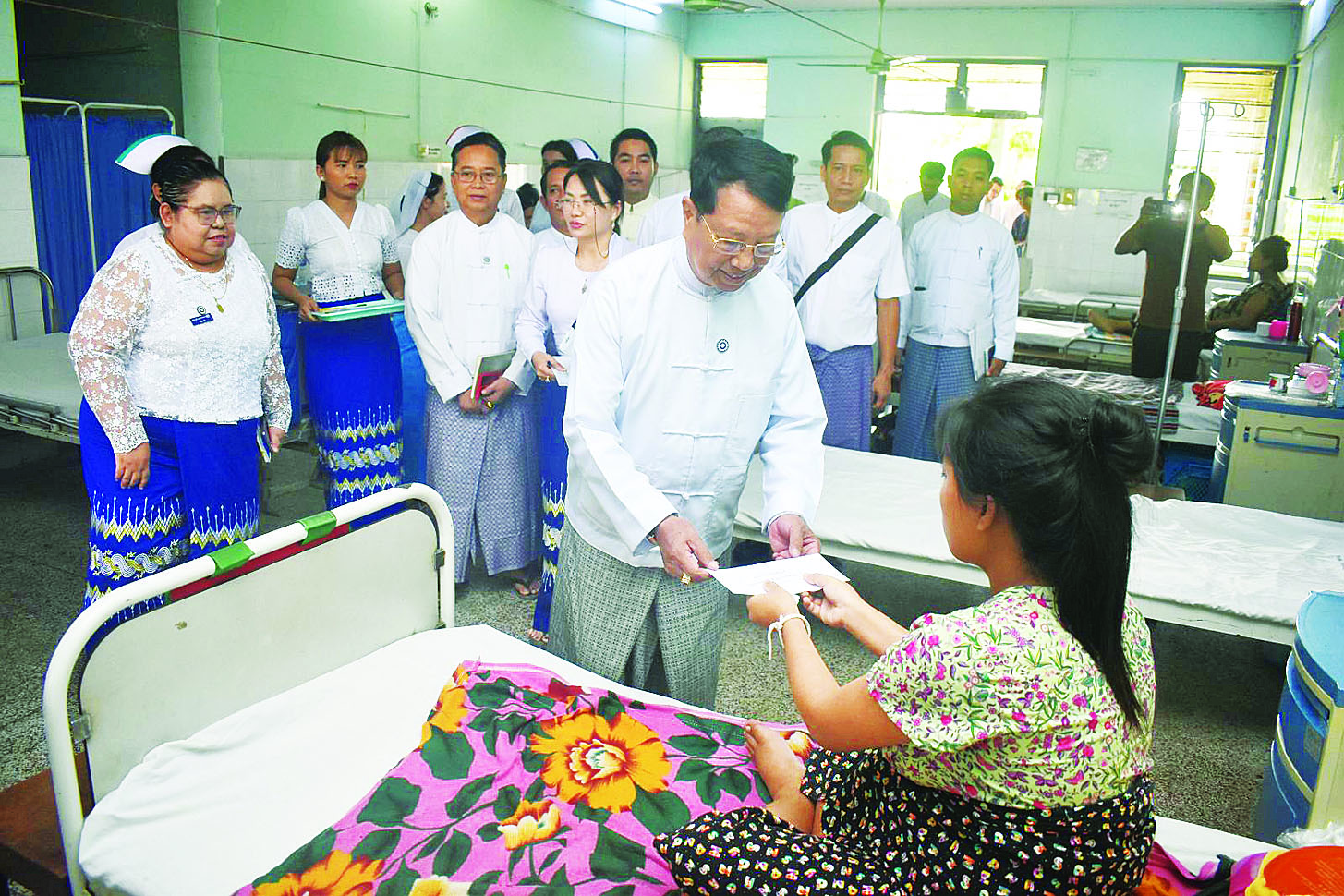 ဦးစွာ ဆေးရုံအစည်းအဝေးခန်းမ၌ ပြည်ထောင်စုဝန်ကြီးက ဆေးရုံအုပ်ကြီးနှင့် ဝန်ထမ်းများအား တွေ့ဆုံ၍ ကျန်းမာရေးစောင့်ရှောက်မှုပေးရသည့် ဝန်ထမ်းများဖြစ်၍ ကုသိုလ်လည်းရ၊ ဝမ်းလည်း ဝသည့်အလုပ်ဖြစ်သဖြင့် စေတနာထားဆောင်ရွက်ပေးစေလိုကြောင်း၊ နိုင်ငံတော်သမ္မတ၏ မိန့်ခွန်းနာခံခြင်းနှင့် ကတိသစ္စာပြုခြင်းအခမ်းအနားတွင် နိုင်ငံတော်သမ္မတက ကျန်းမာရေးကဏ္ဍမြှင့်တင်ရေး၊ တစ်မျိုးသားလုံးကျန်းမာကြံ့ခိုင်ရေးနှင့် ကျန်းမာရေး အဆင့်မြှင့်တင်ရေးလုပ်ငန်းများကို ထိရောက်သည့်မူဝါဒများ ချမှတ်အကောင်အထည်ဖော်ဆောင်ရေး၊ ပြည်သူလူထုကို တိုက်ရိုက်အကျိုးပြုသည့် ကျန်းမာရေးစောင့်ရှောက်မှုလုပ်ငန်းများဖြစ်စေရေး အလေးထားဆောင်ရွက်သွားရန် လမ်းညွှန်မှာကြားခဲ့ကြောင်း၊ နိုင်ငံတော်သမ္မတ၏ လမ်းညွှန်မှာကြားချက်ဖြစ်သော ပညာရေးကဏ္ဍနှင့် ကျန်းမာရေးကဏ္ဍများကို အခြေခံအဆင့်မှစ၍ မြှင့်တင်နိုင်ရေးဆောင်ရွက်သွားမည်ဖြစ်ပါကြောင်း၊ မိမိတို့၏ဝန်ထမ်းများအပါအဝင် ဝန်ထမ်းမိသားစုများ၏ ပညာရေးကိုအဆင့်မြှင့်တင်နိုင်ရေး ဝန်ထမ်းများအနေဖြင့် ဘက်ပေါင်းစုံမှ ဆောင်ရွက်ပေးရန် လိုအပ်ပါကြောင်း။