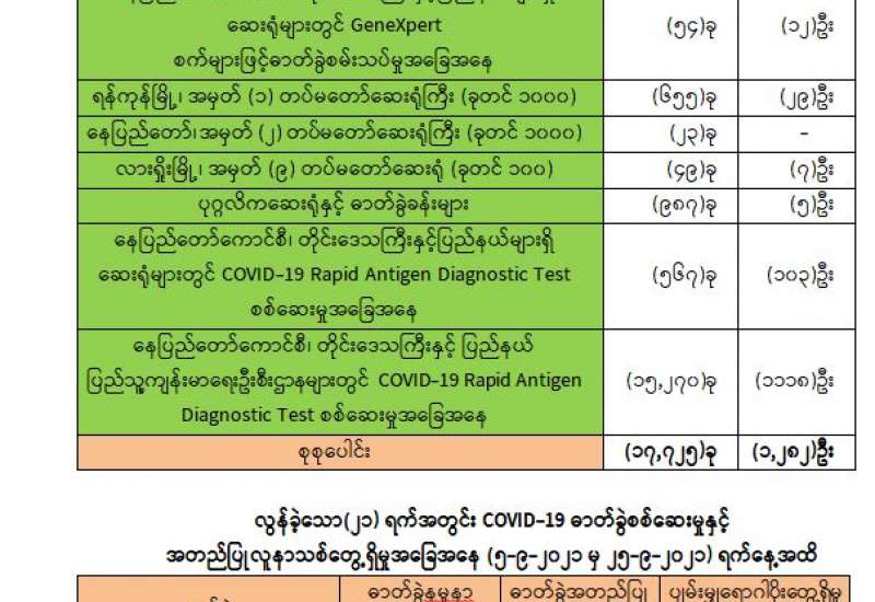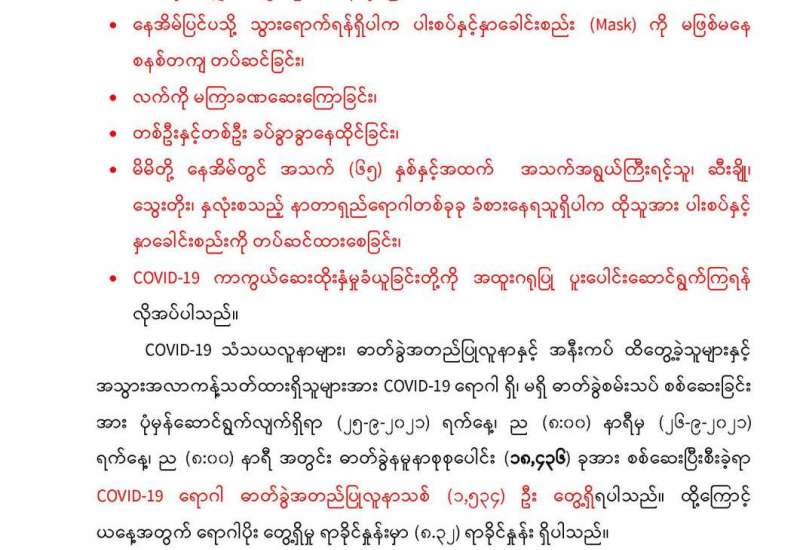 ကျန်းမာရေးဝန်ကြီးဌာနအနေဖြင့် နိုင်ငံအတွင်း ကူးစက်ဖြစ်ပွားနေသော COVID-19 ရောဂါ ကာကွယ်၊ ကုသ၊ ထိန်းချုပ်ရေး လုပ်ငန်းများကို အရှိန်အဟုန်မြှင့်ဆောင်ရွက်လျက်ရှိရာ ရောဂါ ထိန်းချုပ်ရေးလုပ်ငန်းများ အောင်မြင်နိုင်ရေးအတွက် ပြည်သူလူထု အနေဖြင့် ကျန်းမာရေးဝန်ကြီး ဌာနမှ ထုတ်ပြန်ထားသော COVID-19 ရောဂါကာကွယ်ထိန်းချုပ်ရေးဆိုင်ရာ စည်းကမ်းများကို စနစ်တကျ လိုက်နာဆောင်ရွက်ရန်လိုအပ်ပြီး COVID-19 ကာကွယ်ဆေးထိုးနှံမှုခံယူခြင်းအား အထူး ဂရုပြု ပူးပေါင်းဆောင်ရွက် ကြရန်လိုအပ်ပါသည်။