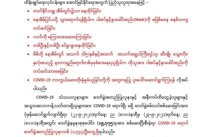 စီးပွားရေးနှင့် ကူးသန်းရောင်းဝယ်ရေးဝန်ကြီးဌာနအနေဖြင့် ကိုဗစ်-၁၉ ရောဂါကာကွယ်၊ ထိန်း ချုပ်၊ ကုသရေး ဆိုင်ရာပစ္စည်းများကို လေကြောင်း၊ ရေကြောင်းနှင့် နယ်စပ်ကုန်သွယ်ရေး စခန်း များမှ အဆင်ပြေချောမွေ့စွာ တင်သွင်းနိုင်ရေးအတွက် အချိန်နှင့်တစ်ပြေးညီ စီစဉ်ဆောင်ရွက်ပေး လျက်ရှိရာ ယနေ့တွင် ရန်ကုန်အပြည်ပြည် ဆိုင်ရာလေဆိပ် ၊ ဆိပ်ကမ်းများနှင့် မူဆယ်၊ မြဝတီနှင့် ချင်းရွှေဟော်နယ် စပ်ကုန်သွယ်ရေးစခန်း (၃)ခု တို့မှ တင်သွင်းရာ၌ ကုမ္ပဏီ (၅) ခုမှ ယာဉ် စီးရေ (၁၀) စီးဖြင့် အောက်ဆီဂျင် (ဓာတ်ငွေ့) Bowser ယာဉ် (၁) စီးဖြင့်တန် (၂၀) ၊ အောက်ဆီဂျင် (အိုးခွံ) (၃၄၆၀)၊ Oxygen Plant (၁)ခု၊ အိမ်သုံး Oxygen Concentrator (၁၀၅) ခုနှင့် နှာခေါင်းစည်း (Mask) (၄၃) တန်တင်သွင်းခဲ့သည်။ အောက်ဆီဂျင်(ဓာတ်ငွေ့) Bowser ယာဉ် (၁) စီးမှာ ပဲခူးမြို့သို့ဖြစ်ပြီး Oxygen Plant (၁)ခုမှာ မူဆယ်မှ ဟားခါးမြို့သို့(၁)ခု ဖြစ်ကြောင်း သိရသည်။