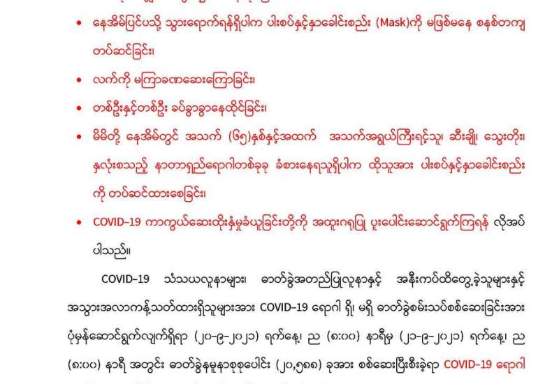 ကိုဗစ်-၁၉ ရောဂါ ဓာတ်ခွဲအတည်ပြုပိုးတွေ့လူနာများနှင့် သီးသန့်စောင့်ကြည့်ရမည့်သူများအား ကျန်းမာရေး စောင့်ရှောက်မှုလုပ်ငန်များကို တပ်မတော်ဆေးရုံများ ကျန်းမာရေးဌာနများနှင့် ကိုဗစ် စင်တာများ၌ တပ်မတော်သား ဆရာဝန်များ၊ ကျန်းမာရေး ဝန်ထမ်းများနှင့် လူမှုရေး အသင်းအဖွဲ့များ ပူးပေါင်း၍ အင်တိုက်အားတိုက်ဆောင်ရွက်ပေးလျှက်ရှိရာ ၎င်းလုပ်ငန်းများတွင် အထောက်အကူဖြစ်စေရန်အတွက် ရန်ကုန်မြို့ မင်းဓ္ဓမလမ်းရှိ တိုးချဲ့ကာကွယ်ဆေး သိုလှောင်ခန်းတွင်ထားရှိသည့် ကိုဗစ်ရောဂါကာကွယ်ဆေးများကို စံချိန်စံညွှန်းများအတိုင်း တိုင်းဒေသကြီးများနှင့်ပြည်နယ် အသီးသီးသို့ တပ်မတော်လေယာဉ်များ Cold Chain Delivery Logistics မော်တော်ယာဉ်ကြီးများဖြင့် ပို့ဆောင်ဖြန့်ဖြူးပေးလျက်ရှိသည်။