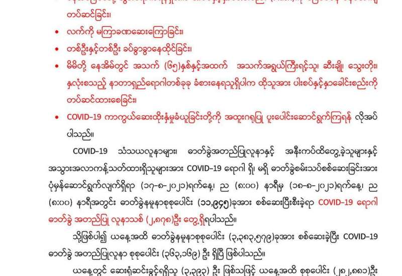 တိုင်းဒေသကြီးနှင့် ပြည်နယ်အသီးသီးရှိ ထေရ်ကြီးဝါကြီး ဆရာတော်ကြီးများ အပါအဝင် လူမျိုးမရွေး၊ ဘာသာမရွေး အသက်(၆၅)နှစ်အထက် သက်ကြီးဘိုးဘွားများ၊ ဌာနဆိုင်ရာ ဝန်ထမ်းများ၊ တိုင်းရင်းသားပြည်သူများနှင့် အကျဉ်းထောင်များ၌ ပြစ်ဒဏ်ကျခံနေသည့် အကျဉ်းသား၊ အကျဉ်းသူများအား ကိုဗစ်- ၁၉ ရောဂါ ကာကွယ်ဆေးထိုးနှံနိုင်ရေးအတွက် ဆေးနှင့်ဆေးပစ္စည်းများကို တပ်မတော် လေယာဉ်များဖြင့် သယ်ယူပို့ဆောင်ပေးခြင်းများနှင့် ကာကွယ်ဆေးထိုးနှံပေးခြင်းများကို ဝိုင်းဝန်း ကြိုးပမ်း ဆောင်ရွက်လျက်ရှိသည်။