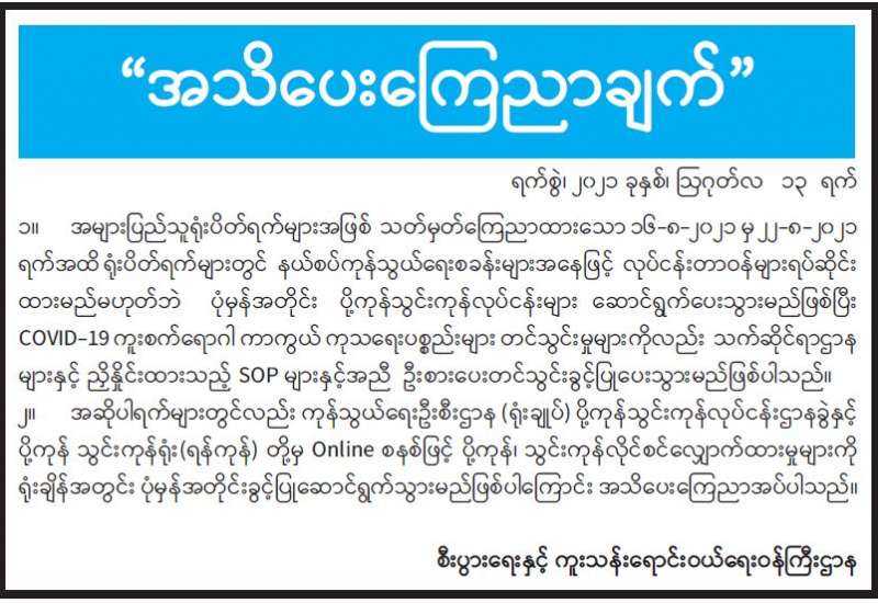 စီးပွားရေးနှင့်ကူးသန်းရောင်းဝယ်ရေးဝန်ကြီးဌာနအနေဖြင့် ကိုဗစ်-၁၉ ကာကွယ်၊ ထိန်းချုပ်၊ ကုသရေးဆိုင်ရာ ပစ္စည်းများကို ပြည်ပမှနှောင့်နှေးကြန့်ကြာမှုမရှိဘဲ တင်သွင်းနိုင်ရေးအတွက် အများပြည်သူ ရုံးပိတ်ရက်များအဖြစ် သတ်မှတ် ကြေညာထားသည့် ဩဂုတ် ၁၆ ရက် မှ၂၂ ရက်အတွင်း နယ်စပ်ကုန်သွယ်ရေးစခန်းများ၌ အလုပ်တာဝန်များ ရပ်ဆိုင်းထားခြင်းမရှိဘဲပုံမှန် အတိုင်း ပို့ကုန်သွင်းကုန်လုပ်ငန်းများ ဆောင်ရွက်ပေးလျက်ရှိသည့်အပြင် ကုန်သွယ်ရေး ဦးစီးဌာန (ရုံးချုပ်) ပို့ကုန်သွင်းကုန်လုပ်ငန်း ဌာနခွဲနှင့် ပို့ကုန်သွင်းကုန်ရုံး(ရန်ကုန်)တို့မှ အွန်လိုင်းစနစ်ဖြင့် ပို့ကုန်သွင်းကုန်လိုင်စင် လျှောက်ထားမှုများကိုလည်း ရုံးချိန်အတွင်းပုံမှန်အတိုင်း ခွင့်ပြု ဆောင်ရွက် ပေးလျက်ရှိသည်။