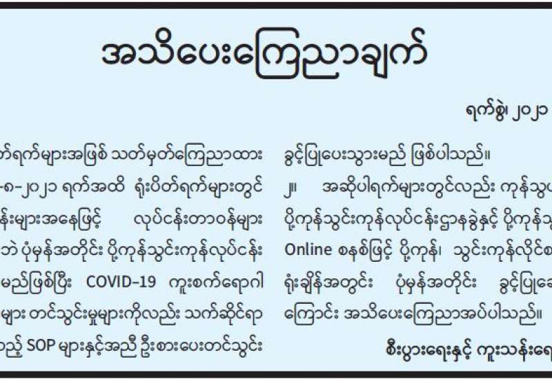 အကောက်ခွန်ဦးစီးဌာနအနေဖြင့် ကိုဗစ်-၁၉ရောဂါ ကာကွယ်၊ ထိန်းချုပ်၊ ကုသရေးဆေးနှင့် ပစ္စည်းများကို လေကြောင်း၊ ဆိပ်ကမ်း၊ နယ်စပ်ဂိတ်အသီးသီးမှ ရုံးပိတ်ရက်ရှည် ကာလအတွင်း နေ့စဉ်ရုံးပိတ်ရက်မရှိ လွယ်ကူ