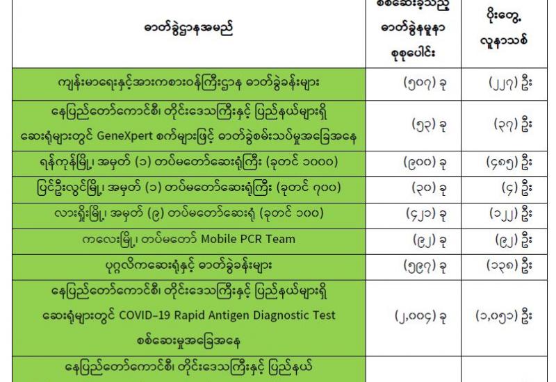 (၁၆-၇-၂၀၂၁) ရက်နေ့၊ ည (၈:၀၀) နာရီမှ (၁၇-၇-၂၀၂၁) ရက်နေ့၊ ည (၈:၀၀) နာရီအတွင်း ဓာတ်ခွဲနမူနာစုစုပေါင်း (၁၄,၀၅၂) ခုအား စစ်ဆေးပြီးစီးခဲ့ရာ COVID-19 ရောဂါ ဓာတ်ခွဲ အတည်ပြု လူနာသစ် (၅,၄၉၇) ဦးတွေ့ရှိရပါသည်။ သို့ဖြစ်ပါ၍ ယနေ့အထိ ဓာတ်ခွဲနမူနာ စုစုပေါင်း (၂,၉၅၇,၅၁၄)ခု အား စစ်ဆေးခဲ့ပြီး COVID-19 ဓာတ်ခွဲအတည်ပြုလူနာ စုစုပေါင်း (၂၂၄,၂၃၆) ဦး ရှိပြီ ဖြစ်ပါသည်။