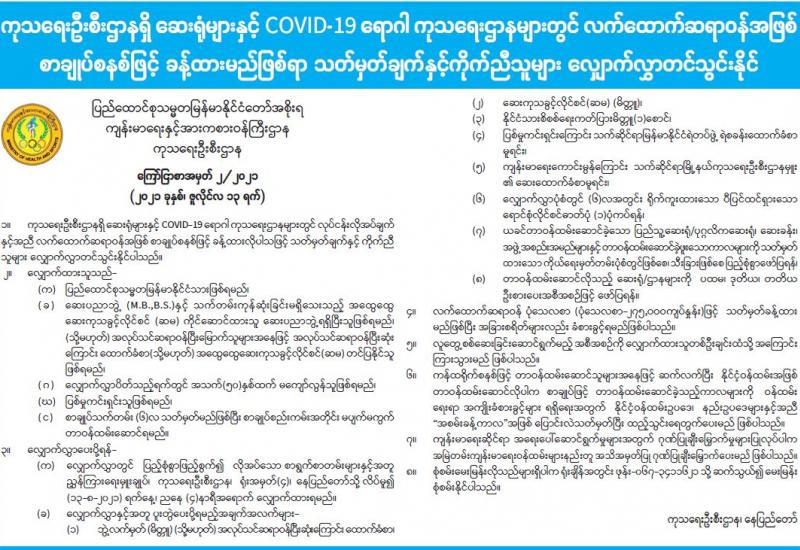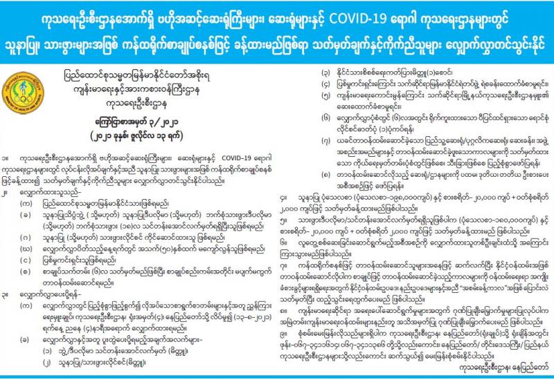 ကိုဗစ်-၁၉ ရောဂါ ဓာတ်ခွဲအတည်ပြု လူနာနှင့် ထိတွေ့ခဲ့သူများ၊ မိမိ ကိုယ်ကိုယ် ကိုဗစ်-၁၉ ရောဂါ သံသယရှိသူများ ကျန်းမာရေးစောင့် ရှောက်မှုခံယူနိုင်သည့်အစီအစဉ်များ ထုတ်ပြန်လိုက်ရာ ၎င်း အစီအစဉ်အရ ကိုဗစ်-၁၉ သံသယရှိပါက သက်ဆိုင်ရာ မြို့နယ်ဒေသန္တရ ကျန်းမာရေးဌာန သို့မဟုတ် မြို့နယ်ဆေးရုံများသို့ သွားရောက်သတင်း ပို့ရမည်ဖြစ်သည်။ မြို့နယ်တွင်သတင်းပို့သည့် သံသယ ရှိသူအား ဓာတ်ခွဲစစ်ဆေးပေးမည်ဖြစ်ပြီး ရောဂါပိုးတွေ့ရှိပါက ဓာတ်ခွဲအတည်ပြု လူနာများ အနေဖြင့် မိမိတို့၏ မြို့နယ်၊ တိုင်းဒေသကြီး၊ ပြည်နယ် ကျန်းမာရေးကော်မတီသို့ ပြန်လည် သတင်းပေးပို့ရမည်ဖြစ်သည်ဟု သိရသည်။
