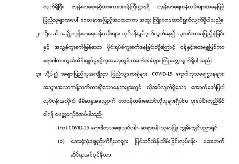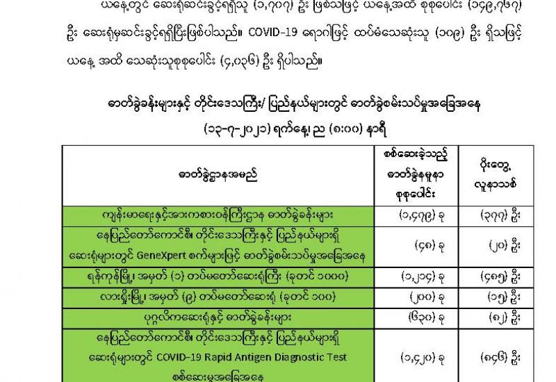 ၁။ ယခုအခါ နိုင်ငံအတွင်း COVID-19 ကပ်ရောဂါ တတိယလှိုင်းအဖြစ် တိုင်းဒေသကြီး/ပြည်နယ် များတွင် COVID-19 ရောဂါ သံသယလူနာနှင့် COVID-19 ရောဂါ ပိုးတွေ့လူနာ များပြား လျက်ရှိပြီး ကျန်းမာရေးနှင့် အားကစား ဝန်ကြီးဌာနရှိ ကျန်းမာရေးဝန်ထမ်းများအနေဖြင့် ပြည်သူများအပေါ် စေတနာအပြည့်အဝထားကာ အထူး ကြိုးစား ဆောင်ရွက်လျက်ရှိပါသည်။