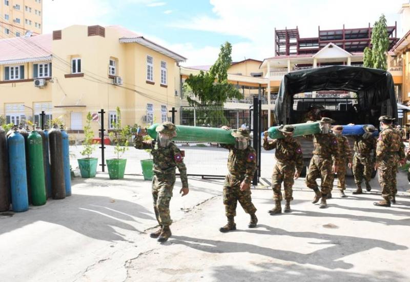 COVID-19 ရောဂါဓာတ်ခွဲအတည်ပြုပိုးတွေ့လူနာများကို ကုသရေးလုပ်ငန်း များ ဆောင်ရွက်ရာ တွင် အောက်ဆီဂျင်လိုအပ်ချက်များကို တစ်ဖက်တစ်လမ်းမှ အထောက်အကူပြုစေရန်အတွက် တပ်မတော်အနေဖြင့် အောက်ဆီဂျင်အိုးများကို ဆေးရုံများနှင့် COVID-19 ရောဂါကုသရေး ဌာနများ အရောက် သွားရောက်လှူ ဒါန်းလျက်ရှိသည်။