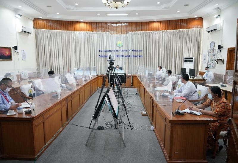 ကိုဗစ်-၁၉ အလွန်ကာလတွင် ခရီးသွားလုပ်ငန်း ရှင်သန်ရပ်တည်နိုင်ရေး အထောက် အကူပြု Application မိတ်ဆက်ရှင်းလင်းတင်ပြသည့် Skylark ကုမ္ပဏီ တာဝန်ရှိသူများနှင့် တွေ့ဆုံညှိနှိုင်း အစည်းအဝေးကို ယနေ့နံနက်ပိုင်းတွင် ဟိုတယ်နှင့်ခရီးသွားလာရေးဝန်ကြီး ဌာန နီလာအစည်းအဝေး ခန်းမ၌ ကျန်းမာရေးနှင့် အားကစားဝန်ကြီးဌာနမှ ထုတ်ပြန် ထားရှိသည့် ကိုဗစ်-၁၉ ရောဂါ ကာကွယ်၊ ထိန်းချုပ်ရေးဆိုင်ရာ ညွှန်ကြားချက်များနှင့်အညီ Social Distancing စနစ်ဖြင့် ကျင်းပသည်။