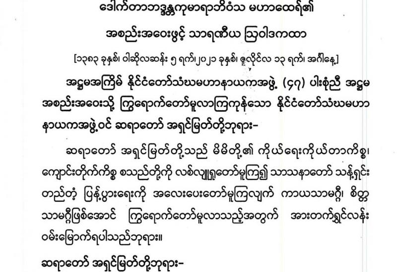 ပြည်ထောင်စုသမ္မတမြန်မာနိုင်ငံတော် အဋ္ဌမအကြိမ် နိုင်ငံတော်သံဃမဟာနာယက အဖွဲ့ (၄၇) ပါးစုံညီ အဋ္ဌမအစည်းအဝေးကို ယနေ့နံနက် ၈ နာရီတွင် ရန်ကုန်မြို့၊ သီရိမင်္ဂလာ ကမ္ဘာအေး ကုန်းမြေရှိ မဟာပါသာဏလိုဏ်ဂူသိမ်တော်ကြီး၌ ကျင်းပသည်။