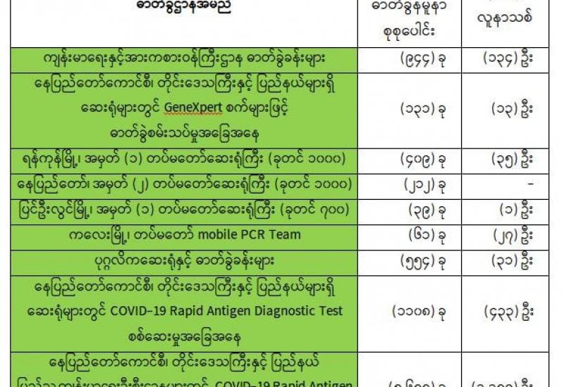 (၁-၇-၂၀၂၁) ရက်နေ့၊ ည (၈:၀၀) နာရီမှ (၂-၇-၂၀၂၁) ရက်နေ့၊ ည (၈:၀၀) နာရီအတွင်း ဓာတ်ခွဲနမူနာစုစုပေါင်း (၉,၁၄၆) ခုအား စစ်ဆေးပြီးစီးခဲ့ရာ COVID-19 ရောဂါ ဓာတ်ခွဲအတည်ပြု လူနာသစ် (၁,၈၆၃) ဦး တွေ့ရှိရပါသည်။ သို့ဖြစ်ပါ၍ ယနေ့အထိ ဓာတ်ခွဲနမူနာစုစုပေါင်း (၂,၇၅၂,၉၂၉)ခု အား စစ်ဆေးခဲ့ပြီး COVID-19 ဓာတ်ခွဲအတည်ပြုလူနာ စုစုပေါင်း (၁၆၁,၂၁၀) ဦး ရှိပြီ ဖြစ်ပါသည်။