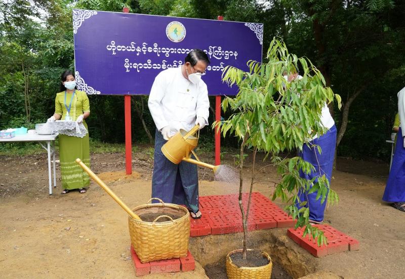 ဟိုတယ်နှင့်ခရီးသွားလာရေးဝန်ကြီးဌာန၏ ၂၀၂၁ ခုနှစ် ပတ်ဝန်းကျင်စိမ်းလန်းစိုပြေရေး လှုပ်ရှားမှု မိုးရာသီသစ်ပင်စိုက်ပျိုးပွဲအခမ်းအနားကို ယနေ့နံနက် ၉ နာရီတွင် နေပြည်တော်ရှိ ဟိုတယ်နှင့်ခရီးသွားလာရေးဝန်ကြီးဌာန၊ ပျိုးဥယျာဉ်အနီး၌ ကျင်းပရာ ပြည်ထောင်စုဝန်ကြီး ဦးမောင်မောင်အုန်းနှင့်ဇနီး တက်ရောက်၍ ကံ့ကော်ပင်အား ဦးဆောင်စိုက်ပျိုးပေးသည်။